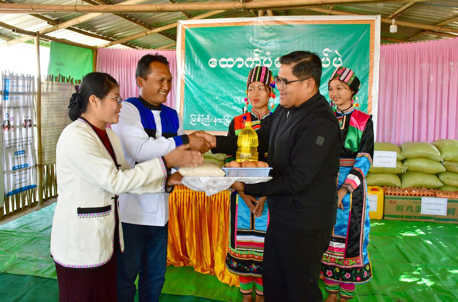 ထို့နောက် ပြည်နယ်ဝန်ကြီးချုပ်က တိမ်းရှောင်မိသားစုများအနေဖြင့် လိုအပ်ချက်များစွာရှိနေ မည်ဖြစ်သော်လည်း နိုင်ငံတော်အစိုးရနှင့် မိမိတို့ပြည်နယ်အစိုးရအဖွဲ့အနေဖြင့် လစဉ်ထောက်ပံ့ပေး လျက်ရှိပါကြောင်း၊ လာမည့်အချိန်ကာလတွင် ပါတီစုံဒီမိုကရေစီ အစိုးရသစ်တက်လာပြီး နေရပ်ပြန် နိုင်ရေးနှင့် တိုင်းပြည်တည်ငြိမ်အေးချမ်းရေးအတွက် မိမိတို့အားလုံးက ဝိုင်းဝန်းဆုတောင်း၍ တစ်ညီ တစ်ညွတ်တည်း ကြိုးစားကြရမည်ဖြစ်ပါကြောင်း အားပေးပြောကြားကာ လိုအပ်ချက်များကို ဌာန ဆိုင်ရာတာဝန်ရှိသူများနှင့် ပေါင်းစပ်ညှိနှိုင်းဆောင်ရွက်ပေးခဲ့ပြီး အိမ်ထောင်စုများ၏ ကလေးငယ်များ အတွက် မုန့်များကို လိုက်လံပေးအပ်ခဲ့ကြသည်။
