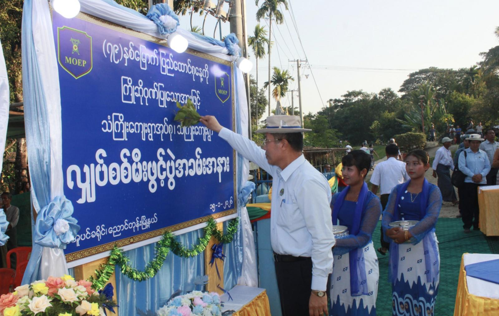 ဆက်လက်၍ တိုင်းဒေသကြီးဝန်ကြီးချုပ်သည် ဖွင့်ပွဲဆိုင်းဘုတ်အား မီးခလုပ်နှိပ်ဖွင့်လှစ်ပေးပြီး အမွှေးနံ့သာများပက်ဖြန်းပေးခဲ့ကာ စုပေါင်းမှတ်တမ်းတင်ဓါတ်ပုံများရိုက်ကူး၍ ကျေးရွာအတွင်းရှိ နေအိမ်များတွင် တပ်ဆင်ထားသော လျှပ်စစ်မီတာများနှင့် လျှပ်စစ်မီးသုံးစွဲနေမှု အခြေအနေများအား လိုက်လံကြည့်ရှုစစ်ဆေးခဲ့ပြီး လျှပ်စစ်မီးအားစနစ်တကျသုံးစွဲစေရေး မှာကြားခဲ့ကြောင်းသိရသည်။