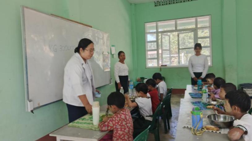 ထိုသို့ အာဟာရကျွေးမွေးရာတွင် မြို့နယ်ပြည်သူ့ကျန်းမာရေးဦးစီးဌာနဝန်ထမ်းများ၊ ဆရာ/ဆရာမများ၊ ကျောင်းအကျိုးတော်ဆောင်ကော်မတီဝင်များနှင့် ပူးပေါင်းကာ ကျောင်းသား/ ကျောင်းသူများအား တစ်ကိုယ်ရေသန့်ရှင်းရေးနှင့် ပတ်သက်သည့် အကြောင်းအရာများအား ရှင်းလင်းပြောကြားခဲ့ပြီး KG တန်းကျောင်းသား၊ ကျောင်းသူများအား အာဟာရဖြစ်စေမည့် အစားအစာများ ကျွေးမွေးခဲ့ကြောင်း သိရသည်။