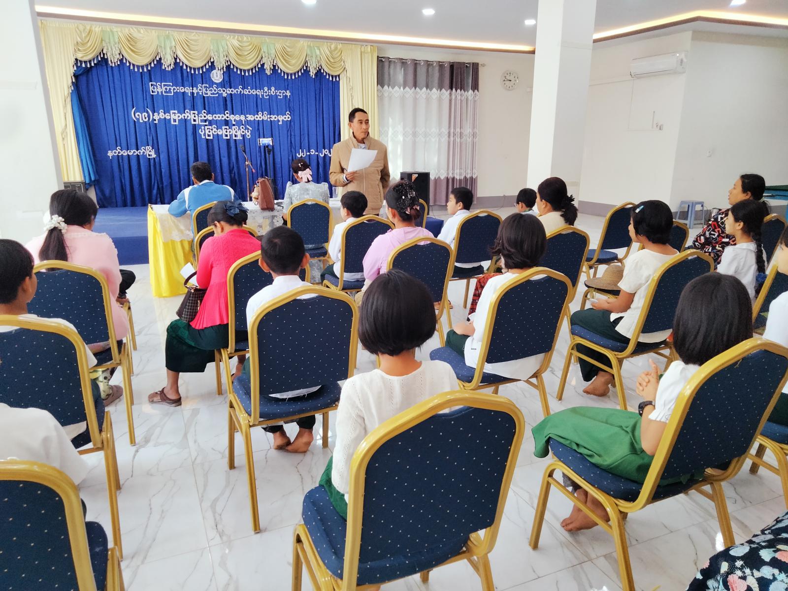 ရှေးဦးစွာ မြို့နယ်ပြန်ကြားရေးနှင့်ပြည်သူ့ဆက်ဆံရေးဦးစီးဌာန ဦးစီးအရာရှိ ဒေါ်ဥမ္မာခင်က (၇၉)နှစ်မြောက် ပြည်ထောင်စုနေ့ အထိမ်းအမှတ် မူအောက်ဆင့်ပုံပြင်ပြောပြိုင်ပွဲ ကျင်းပရခြင်း ရည်ရွယ်ချက်ကို ရှင်းလင်းပြောကြားပြီး ဒိုင်အဖွဲ့ဝင် ဆရာတစ်ဦးကပြိုင်ပွဲ၏ အမှတ်ပေးစည်းကမ်းချက်များကို ရှင်းလင်းပြောကြားခဲ့သည်။
