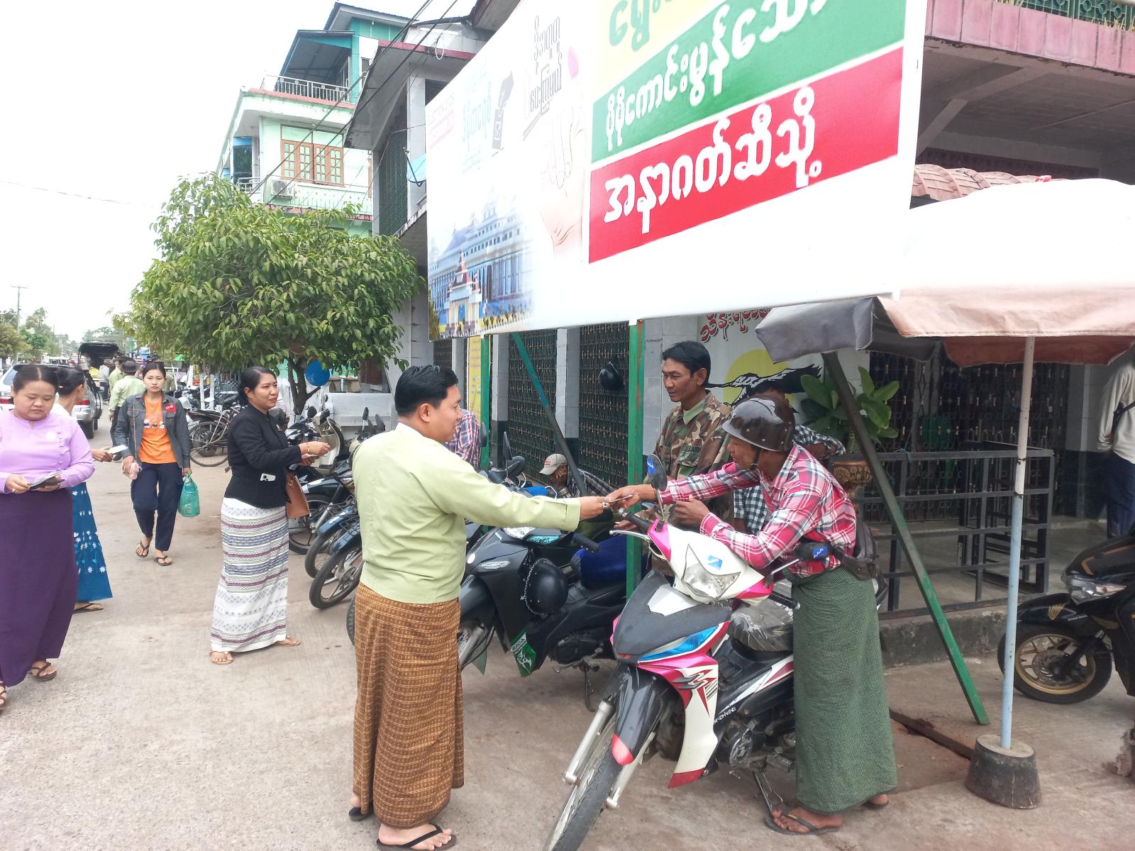 အဆိုပါလက်ကမ်းစာစောင်များဖြန့်ဝေခြင်းကို မြို့နယ်စီမံခန့်ခွဲရေးနှင့်အုပ်ချုပ်ရေးကော်မတီ ဥက္ကဋ္ဌ ဦးခင်မောင်ဦးနှင့်အဖွဲ့ဝင်များ၊ မြို့နယ်ဌာနဆိုင်ရာ အကြီးအကဲများ၊ ပြန်ကြားရေးနှင့်ပြည်သူ့ဆက်ဆံ ရေးဦးစီးဌာနမှမြို့နယ်ဦးစီးမှူး ဒေါ်နုနုအေး၊ အမျိုးသမီးရေးရာအဖွဲ့ဝင်များ၊ မိခင်နှင့်စောင့်ရှောက် ရေးအသင်းအဖွဲ့များ ပူးပေါင်း၍ ဈေးရောင်း၊ ဈေးဝယ်ပြည်သူများ၊ လမ်းသွားလမ်းလာပြည်သူများ ၊မော်တော်ယာဉ်၊မော်တော်ဆိုင်ကယ်များဖြင့် သွားလာကြသည့် ခရီးသွားပြည်သူများအား ရွေးကောက်ပွဲနှင့်ပတ်သက်၍ ကျယ်ကျယ်ပြန့်ပြန့်သိရှိစေရန် အတွက်လက်ကမ်းစာစောင်များကို ဖြန့်ဝေပေးခဲ့ကြောင်းသိရသည်။