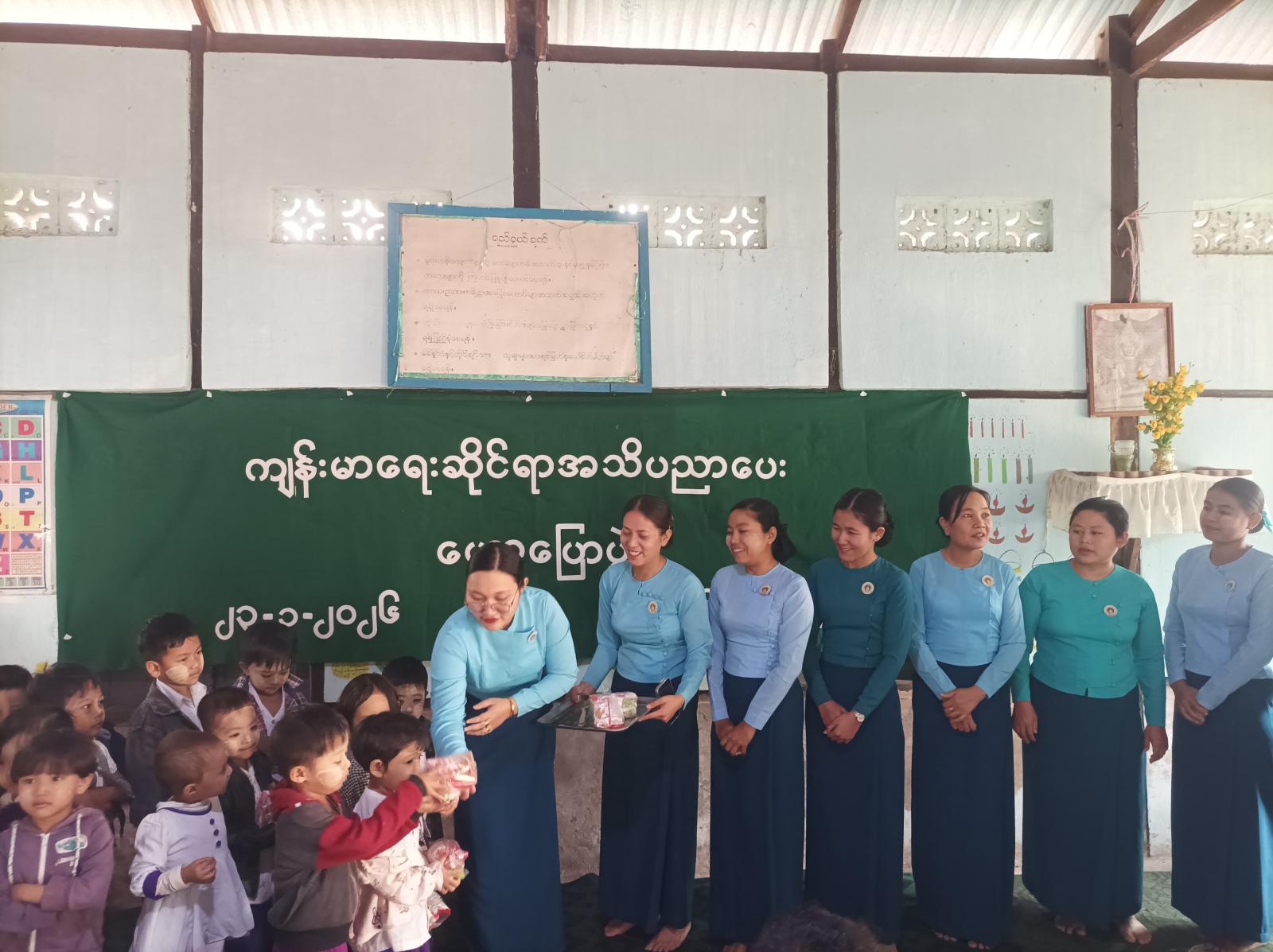 ဆက်လက်ပြီး အခမ်းနားသို့ မြို့နယ်အမျိုးသမီးရေးရာအဖွဲ့ဝင်များ၊ မြို့နယ်မိခင်နှင့်ကလေးစောင့်ရှောက်ရေးအဖွဲ့ဝင်များ၊ မြို့နယ်ပြည်သူ့ကျန်းမာရေးဦးစီးဌာန ဝန်ထမ်းများ၊ မူကြိုကလေးမိဘများ၊ မူကြိုကျောင်းသား၊ ကျောင်းသူလေးများ တက်ရောက်ခဲ့ကြပြီး မြို့နယ်အမျိုးသမီးရေးရာအဖွဲ့ဝင်များ၊ မြို့နယ်မိခင်နှင့်ကလေးစောင့်ရှောက်ရေးအဖွဲ့ဝင်များက မူကြိုကျောင်းသား၊ ကျောင်းသူလေးများအား မုန့်နှင့် ရေသန့်ဘူးများ ဖြန့်ဝေပေးခဲ့ကြကြောင်း သိရသည်။