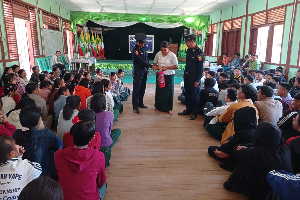 ဆက်လက်၍ ဂန့်ဂေါမြို့နယ်မီးသတ်ဦးစီးမှူး ဦးစီးအရာရှိ ဦးဇော်ရဲနိုင်မှ စာသင်ကျောင်းအခြေပြု မီးဘေးလုံခြုံရေးအသိပညာပေးဟောပြောခြင်းနှင့် ကျောင်းသား/ကျောင်းသူများအား မီးသတ်ဆေးဘူးအသုံးပြု၍ မီးငြှိမ်းသတ်မှုများကို လက်တွေ့သရုပ်ပြသင်ကြားပြခြင်းများကို အသိပညာပေးဟောပြောခဲ့ကြသည်။