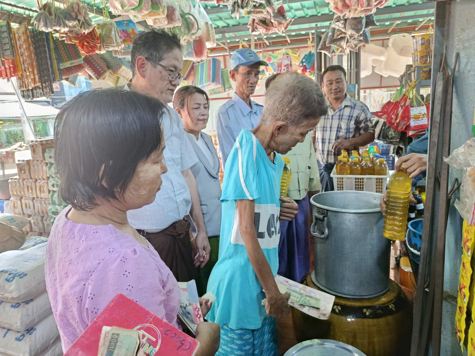 ပဲခူးတိုင်းဒေသကြီး၊ စားသုံးသူရေးရာဦးစီးဌာန၊ ပဲခူးတိုင်းဒေသကြီး၊ ဆီကုန်သည်နှင့်ဆီလုပ်ငန်းရှင်များအသင်းတို့ပူးပေါင်း၍ စီးပွားရေးနှင့်ကူးသန်းရောင်းဝယ်ရေးဝန်ကြီးဌာနမှ ချမှတ်ထားသည့် မှန်(၆)မှန်နှင့်အညီ သတ်မှတ်ရည်ညွှန်းစျေးအတိုင်း စားသုံးသူပြည်သူများ ဝယ်ယူရရှိမှု ရှိ/မရှိကို ယနေ့နံနက်ပိုင်းက ကဝမြို့နယ်ရပ်ကွက်များနှင့် သက္ကလမြို့ ဈေးအတွင်း စားအုန်းဆီရောင်းချနေမှုများအား သတ်မှတ်စျေးနှုန်း၊ အလေးချိန်၊ သတ်မှတ်ပမာဏမှန်ကန်မှုရှိမရှိ လိုက်လံကြည့်ရှုစစ်ဆေးသည်။