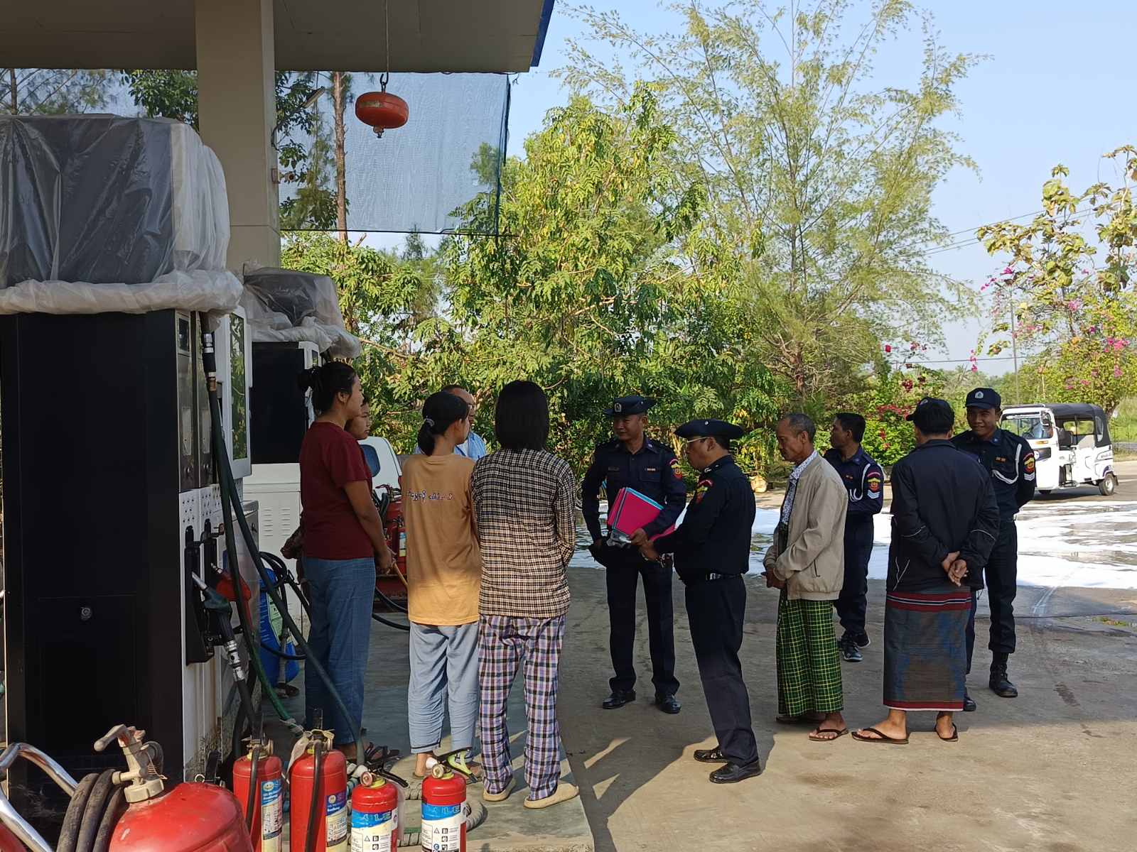 မီးဘေးလုံခြုံရေး စစ်ဆေးဆောင်ရွက်ရာတွင် ဆီဆိုင်များ၌ မီးသတ်ဆေးဘူးအပါအဝင် မီးဘေးလုံခြုံရေး ပစ္စည်းကိရိယာများ ထားသိုသုံးစွဲခြင်း ရှိ၊မရှိ၊ သတ်မှတ်စည်းကမ်းများနှင့်အညီ ဆီသိုလှောင်ရောင်းချမှု ရှိ/မရှိ၊ မီးငြိမ်းသတ်နည်းပစ္စည်းကိရိယာများ၊ ဆီမီးငြှိမ်းသတ်ရေး ပစ္စည်းကိရိယာများ၊ လောင်စာဆီမီးငြှိမ်းသတ်သည့် (FOAM) ဆေးရည်များထားရှိမှု ရှိ၊ မရှိ စသည်တို့ကို စစ်ဆေးဆောင်ရွက်ပြီး ဆီဆိုင်ပိုင်ရှင်များနှင့် ဝန်ထမ်းများအား မီးဘေးလုံခြုံရေးနှင့် ပတ်သတ်၍ လိုက်နာဆောင်ရွက်ရမည့်ကိစ္စရပ်များ၊ ရှောင်ကျဉ်ရမည့်ကိစ္စရပ်များအား လမ်းညွှန် မှာကြားခဲ့ကြကြောင်း သိရသည်။