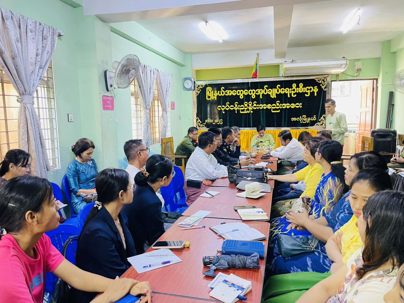 အစည်းအဝေးတွင် မြို့နယ်စီမံခန့်ခွဲရေးနှင့် အုပ်ချုပ်ရေးကော်မတီဥက္ကဋ္ဌ ဦးရဲကိုကိုက အဖွင့်အမှာစကားပြောကြားခဲ့ရာ ရွေးကောက်ပွဲ အပိုင်း (၃) ထိ အားလုံးပါဝင်ဆောင်ရွက်ပေးကြသည့်အတွက် အောင်မြင်စွာ ဆောင်ရွက်နိုင်ခဲ့ကြောင်း၊ တိုင်းဒေသကြီးအစိုးရအဖွဲ့နှင့် ခရိုင်စီမံခန့်ခွဲရေးနှင့် အုပ်ချုပ်ရေးကော်မတီ၏ အစည်းအဝေးဆုံးဖြတ်ချက်များ၊ လမ်းညွှန်မှာကြားချက်များအား ချပြရှင်းလင်းခြင်း၊ လာမည့်ပြည်ထာင်စုနေ့ အခမ်းအနားအား အောင်မြင်စွာ ကျင်းပနိုင်ရေးအတွက် ဝိုင်းဝန်းပူးပေါင်းကူညီဆောင်ရွက်ပေးရန်၊ ဌာနဆိုင်ရာများမှ မိမိတို့ဌာနများမှ ဆောင်ရွက်လျက်ရှိသည့် လုပ်ငန်းများ အကောင်အထည်ဖော်ဆောင်ရွက်နေမှုများ၊ ဌာနဆိုင်ရာများအချင်းချင်း ညှိနှိုင်းဆောင်ရွက်ရမည့် ကိစ္စရပ်များအား ပူးပေါင်းဆောင်ရွက်ရန်၊ ထူးခြားဖြစ်စဉ်များရှိပါက အချိန်နှင့်တစ်ပြေးညီ သတင်းပေးပို့ရန်ဆွေးနွေးခဲ့ပြီး ရပ်ကွက်အုပ်ချုပ်ရေးမှူးများမှ မိမိတို့ရပ်ကွက်အလိုက် ဆောင်ရွက်နေသည့် ကိစ္စများအား ညှိနှိုင်းဆွေးနွေးခဲ့ကြသည်။