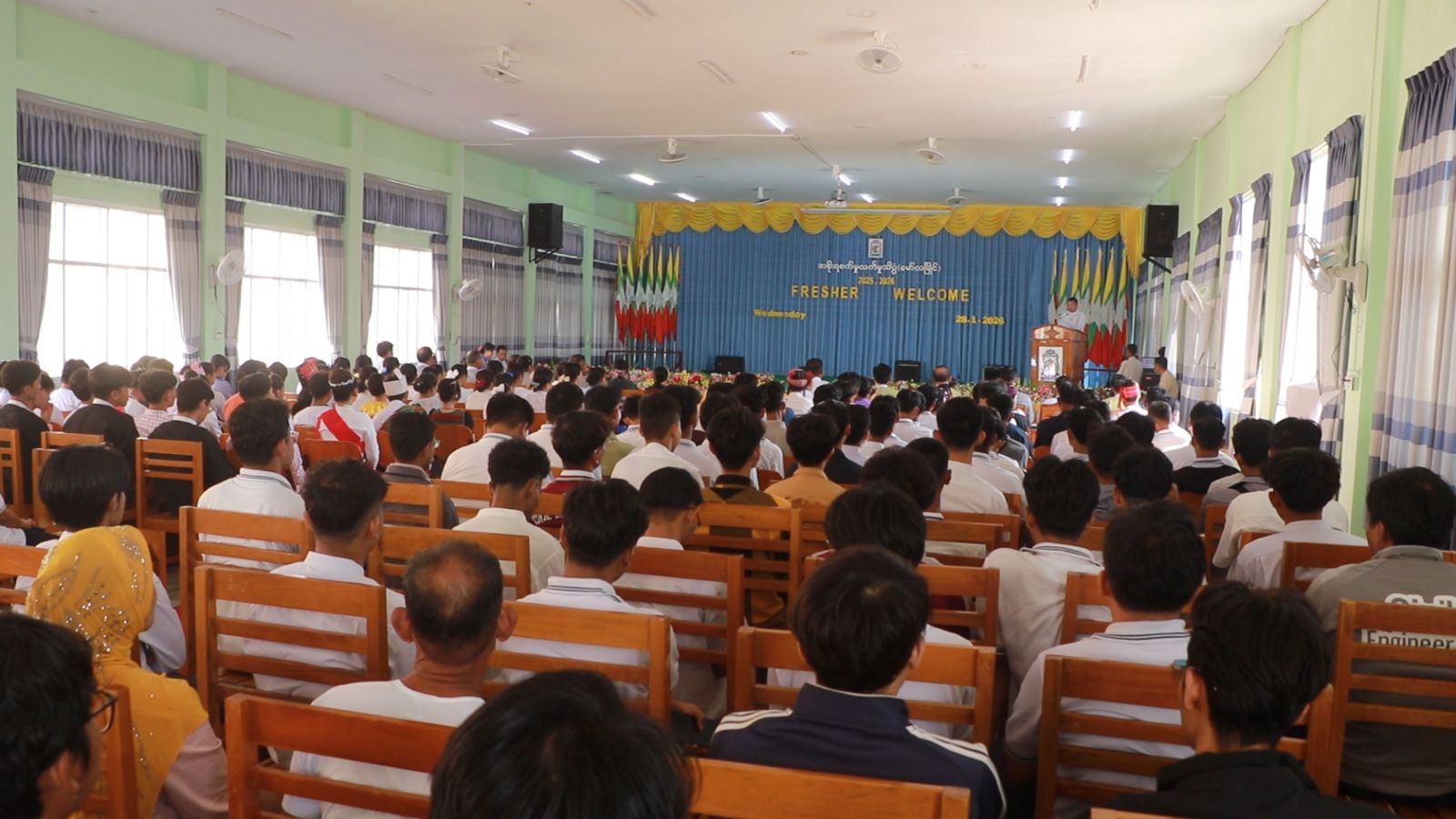 ထို့နောက် အစိုးရစက်မှုလက်မှုသိပ္ပံ(မော်လမြိုင်)၊ ကျောင်းအုပ်ကြီး ဦးညိုချောမှ ကြိုဆို နှုတ်ခွန်းဆက်စကားပြောကြားခဲ့ပြီး ကျောင်းသား၊ ကျောင်းသူလေးများက တေးသရုပ်ဖော် တိုင်းရင်းသားရိုးရာအကအလှများဖြင့် ဖျော်ဖြေတင်ဆက်ခဲ့ကြသည်။