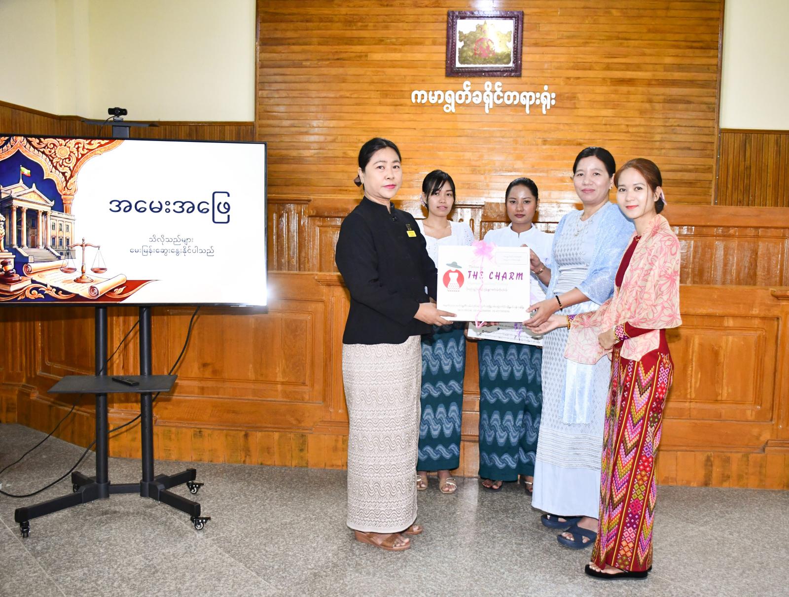 ဆက်လက်၍ လေ့လာရေးလာရောက်သည့် ဆရာမများအား ကမာရွတ်ခရိုင်တရားရုံး အမှတ်တရလက်ဆောင်ပစ္စည်းများ ပေးအပ်ခဲ့သည်။ ထို့နောက် ကျောင်းသား၊ ကျောင်းသူများက ခရိုင်တရားရုံးရှိ တရားခွင်များတွင် ရာဇဝတ်မှုများ၊ တရားမမှုများ ကြားနာစစ်ဆေးနေခြင်းများကို လက်တွေ့လေ့လာခဲ့ကြောင်း သိရှိရသည်။