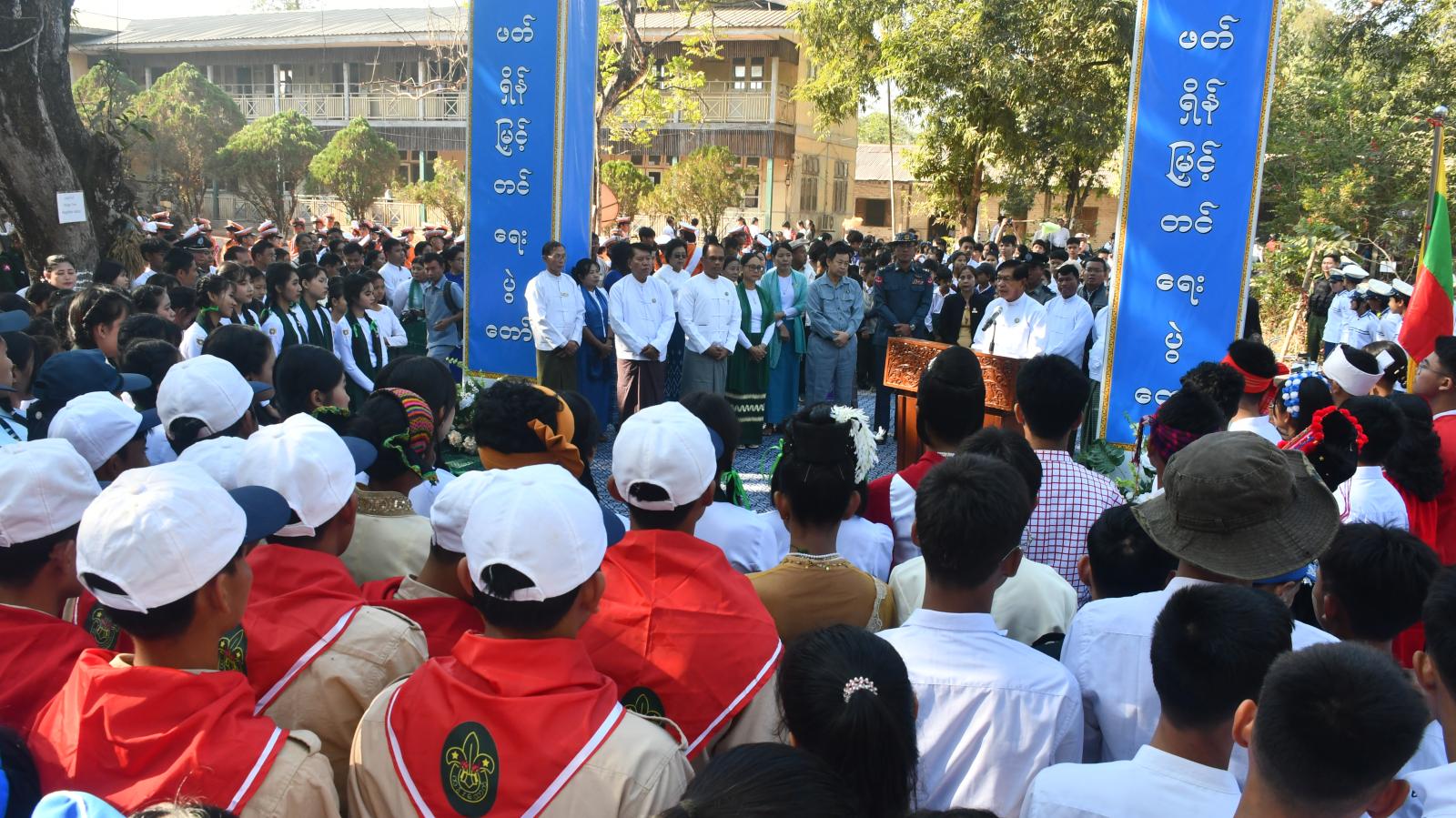 ဦးစွာ ရန်ကုန်တိုင်းဒေသကြီး ဝန်ကြီးချုပ် ဦးစိုးသိန်းနှင့် အဖွဲ့က ကျောင်းသား၊ ကျောင်းသူများက ဘင်ခရာတီးဝိုင်းနှင့် ပန်းပွားအကဖြင့် ဖျော်ဖြေနေမှုအား ကြည့်ရှုအားပေးသည်။