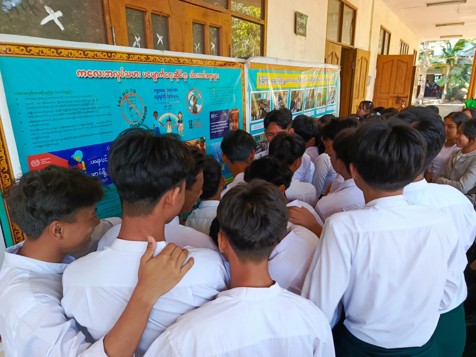 အဆိုပါ ဟောပြောပွဲတွင် ပြန်ကြားရေးနှင့်ပြည်သူ့ဆက်ဆံရေးဦးစီးဌာနမှ ကျောင်းသူကျောင်းသားများ လေ့လာနိုင်ရန် စာဖတ်ရှိန်မြှင့်တင်ရေး၊ ကလေးအလုပ်သမားပပျောက်ရေး စသည့်အသိပညာပေး နံရံကပ်စာစောင်များတို့ကို ခင်းကျင်းပြသရာ ကျောင်းသား၊ ကျောင်းသူများမှစိတ်ပါ၀င်စားစွာ ကြည့်ရှုလေ့လာခဲ့ကြောင်း သိရသည်။