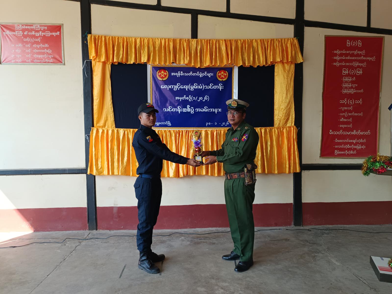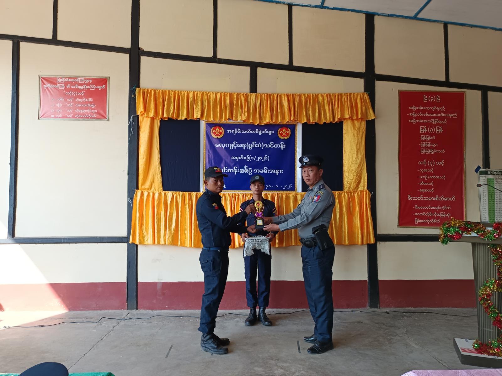 ဆက်လက်၍ သင်တန်းတွင်ထူးချွန်ဆုရရှိသည့် အရန်မီးသတ်တပ်ဖွဲ့ဝင်များ၊ သင်တန်းတွင် စံပြဆုရရှိသူများအား ဆုများချီးမြှင့်ခဲ့ကြပြီး သင်တန်းသားများအား သင်တန်းဆင်းလက်မှတ်များကို ဗိုလ်မှူး ရဲထွဋ်အောင်နှင့် အဖွဲ့ဝင်များက ဆုများအသီးသီးပေးအပ်ချီးမြှင့်ခဲ့ကြသည်။