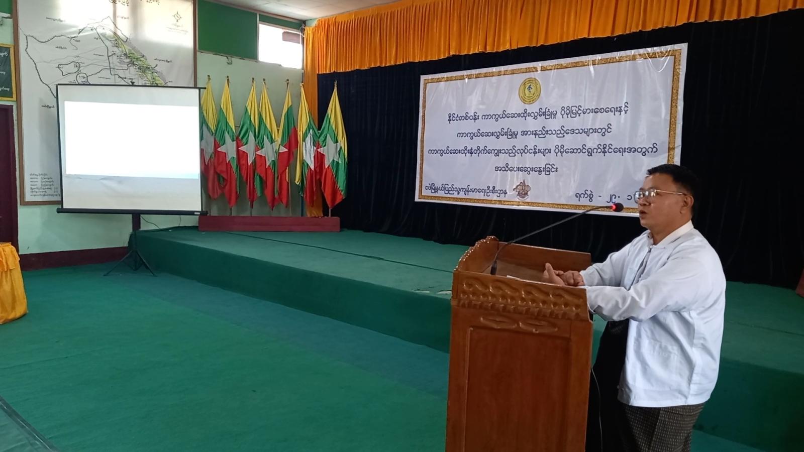 ဆက်လက်၍ မြို့နယ်ပြည်သူ့ကျန်းမာရေးနှင့်ကုသရေးဦးစီးဌာနမှူး ဒေါက်တာအုန်းဝင်းက မြို့နယ်အတွင်း ကာကွယ်ဆေးထိုးလွှမ်းခြုံမှု ပိုမိုမြင့်မားစေရေးနှင့် ကာကွယ်ဆေး လွှမ်းခြုံမှုအားနည်းသည့်ဒေသများတွင် ကာကွယ်ဆေးထိုးနှံတိုက်ကျွေးသည့်လုပ်ငန်းများ၊ တိုးချဲ့ကာကွယ် ဆေးထိုးနှံတိုက်ကျွေးခြင်း၏ အဓိကရည်ရွယ်ချက်များနှင့် သွားလာရေး ခက်ခဲသောဒေသများ၊ ပြောင်းရွှေ့ရောက်ရှိလာသည့် ကလေးငယ်များအား ကာကွယ်ဆေးထိုးနှံတိုက်ကျွေးခြင်းလုပ်ငန်းများ အားဖြည့်ဆောင်ရွက်နိုင်ရန်အတွက် အကောင်အထည်ဖော်ဆောင်ရွက်နိုင်မည့် လုပ်ငန်းစဉ်များကို Power Point ဖြင့် အသေးစိတ် ရှင်းလင်းဆွေးနွေးသည်။