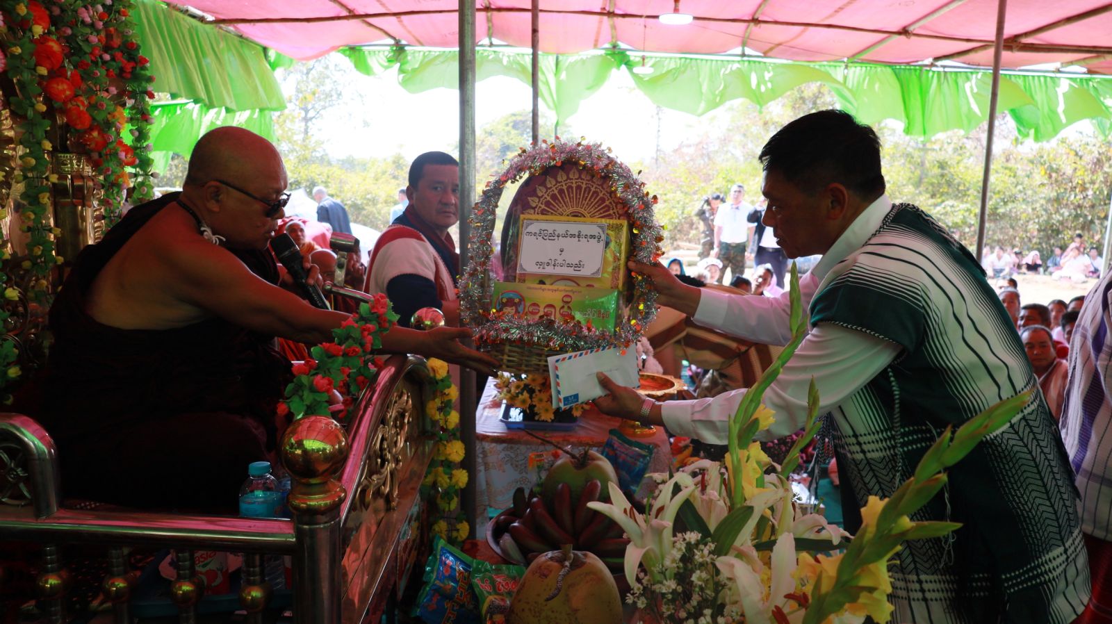ထို့နောက် ပြည်နယ်လူမှုရေးရာဝန်ကြီး ဦးစောထွန်းအောင်က မြိုင်ကြီးငူဆရာတော်အား လှူဖွယ်ဝတ္ထုအစုစုနှင့် နဝကမ္မအလှူငွေတို့အား ဆက်ကပ်လှူဒါန်းပြီး ရေစက်သွန်းချ အမျှပေးဝေခဲ့ကြောင်း သိရသည်။