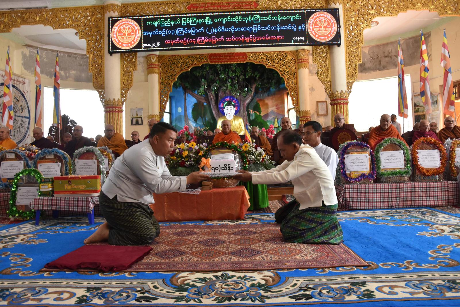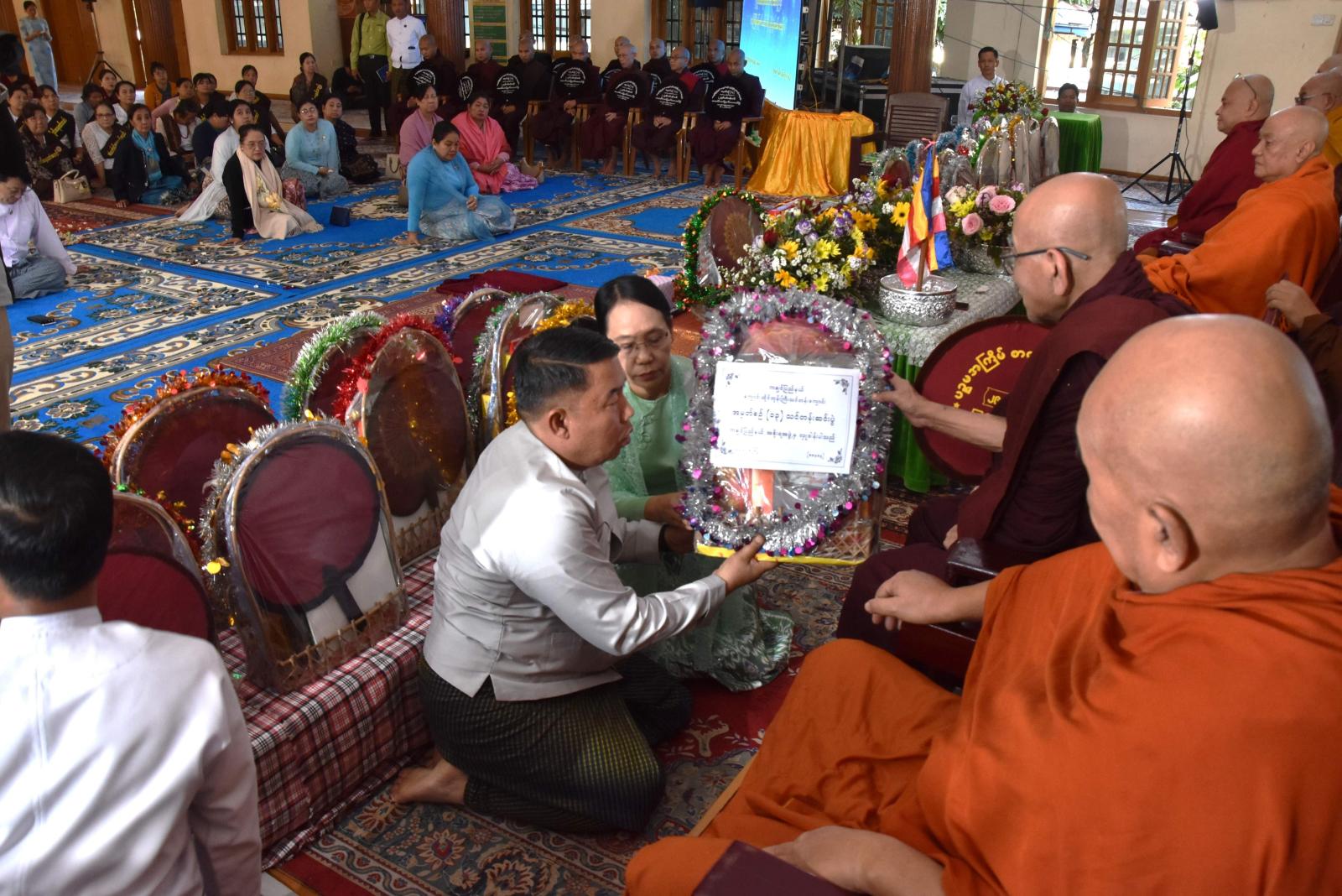 ထို့နောက် ပြည်နယ်ဝန်ကြီးများနှင့်တာဝန်ရှိသူများက သံဃာတော်များထံ လှူဖွယ်ပစ္စည်းများ ကို ဆက်ကပ်လှူဒါန်းခဲ့ကြပြီး ပြည်နယ်အစိုးရအဖွဲ့ဝင် လုံခြုံရေးနှင့်နယ်စပ်ရေးရာဝန်ကြီးက (၁၄) ကြိမ်မြောက်သင်တန်းအတွက် ငွေကျပ်သိန်း (၇၀) ကို လှူဒါန်းပေးခဲ့သည်။