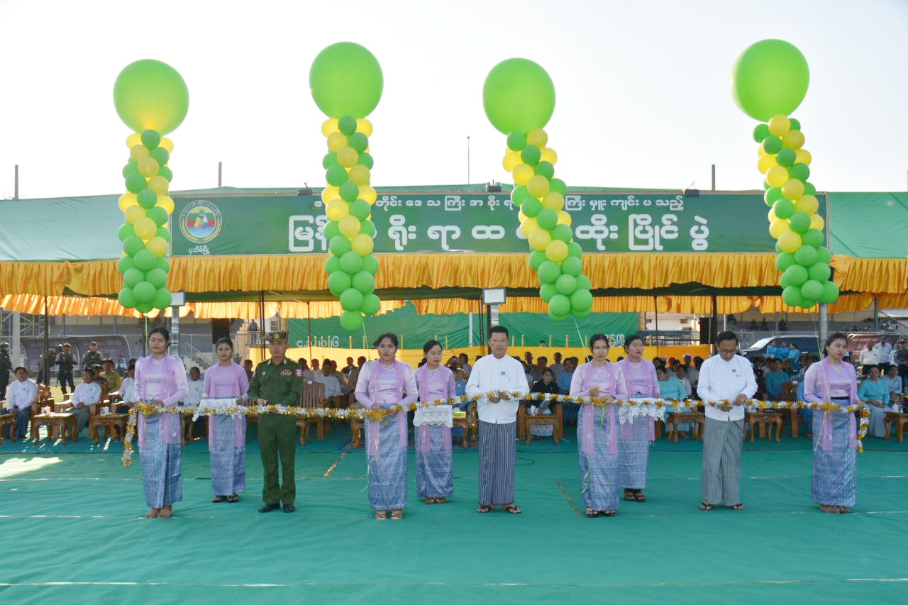 ဦးစွာ တိုင်းဒေသကြီးဝန်ကြီးချုပ်သည် လုံခြုံရေးနှင့်နယ်စပ်ရေးရာဝန်ကြီး၊ စီးပွားရေးရာဝန်ကြီးတို့နှင့်အတူ မြန်မာ့ရိုးရာထမနဲထိုးပြိုင်ပွဲအား ဖဲကြိုးဖြတ်ဖွင့်လှစ်ပေးသည်။