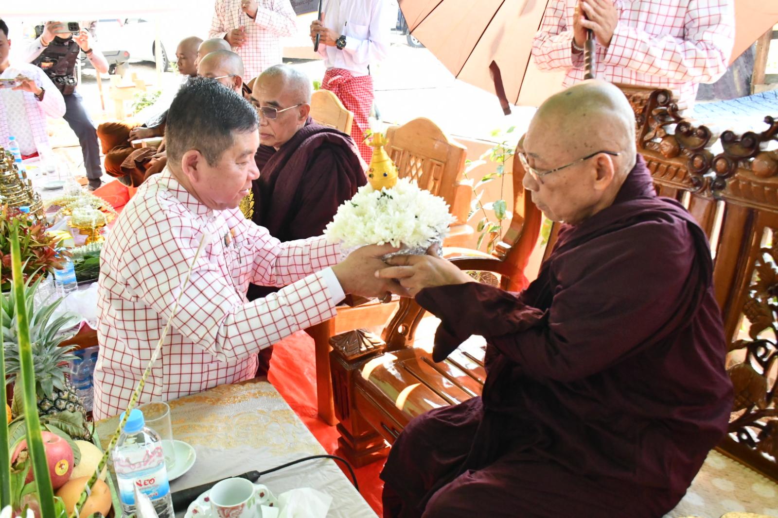 ထို့နောက် ပြည်နယ်ဝန်ကြီးချုပ်နှင့် တာဝန်ရှိသူများ၊ အလှူရှင်များက စေတီတော်မြတ်ကြီးထံ တင်လှူပူဇော်မည့် စိန်ဖူးတော်၊ ရွှေထီးတော်တို့အား ဆရာတော်ကြီးများထံ ဆက်ကပ် လှူဒါန်းပူဇော်ခဲ့ပြီး ဆရာတော်အရှင်သူမြတ်များထံသို့ လှူဖွယ်ဝတ္ထုပစ္စည်းများ ဆက်ကပ်လှူဒါန်းခဲ့ကြကာ လှူဒါန်းမှုအစုစုတို့အတွက် အနုမောဒနာ တရားနာယူကြည်ညိုပြီး ရေစက်သွန်းချ အမျှပေးဝေခဲ့ကြသည်။