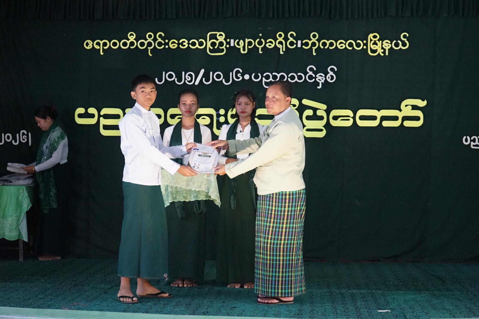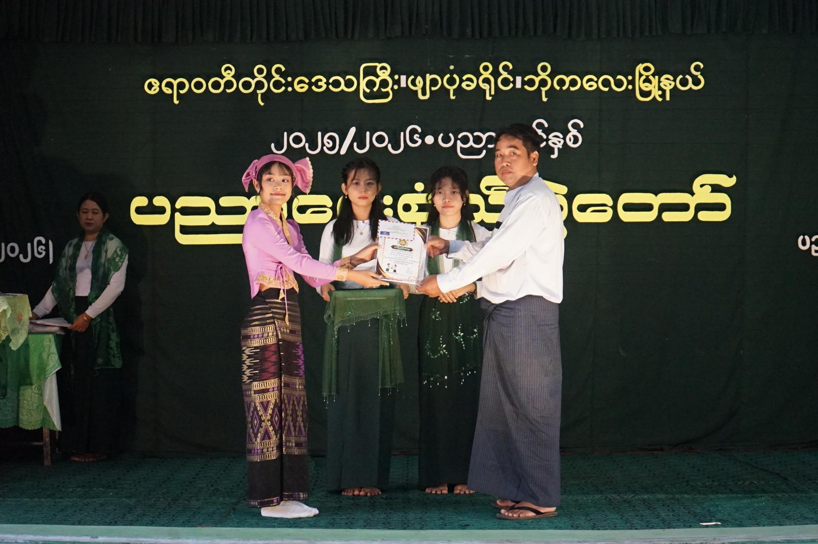 ဆက်လက်၍ တာဝန်ရှိသူများက ၂၀၂၅-၂၀၂၆ ပညာသင်နှစ်အတွင်း တိုင်း၊ ခရိုင်၊ မြို့နယ်အဆင့် ကဏ္ဍပေါင်းစုံ၌ ထူးချွန်ခဲ့ကြသော ကျောင်းသား/သူများအား ပညာရည်ချွန်ဆုများချီးမြှင့် ပေးအပ်ခဲ့ပြီး အခြေခံပညာကျောင်းပေါင်းစုံမှ ကျောင်းသား/သူများကလည်း ဖျော်ဖြေရေးကဏ္ဍများဖြင့် တင်ဆက်ခဲ့ကြကြောင်းသိရသည်။