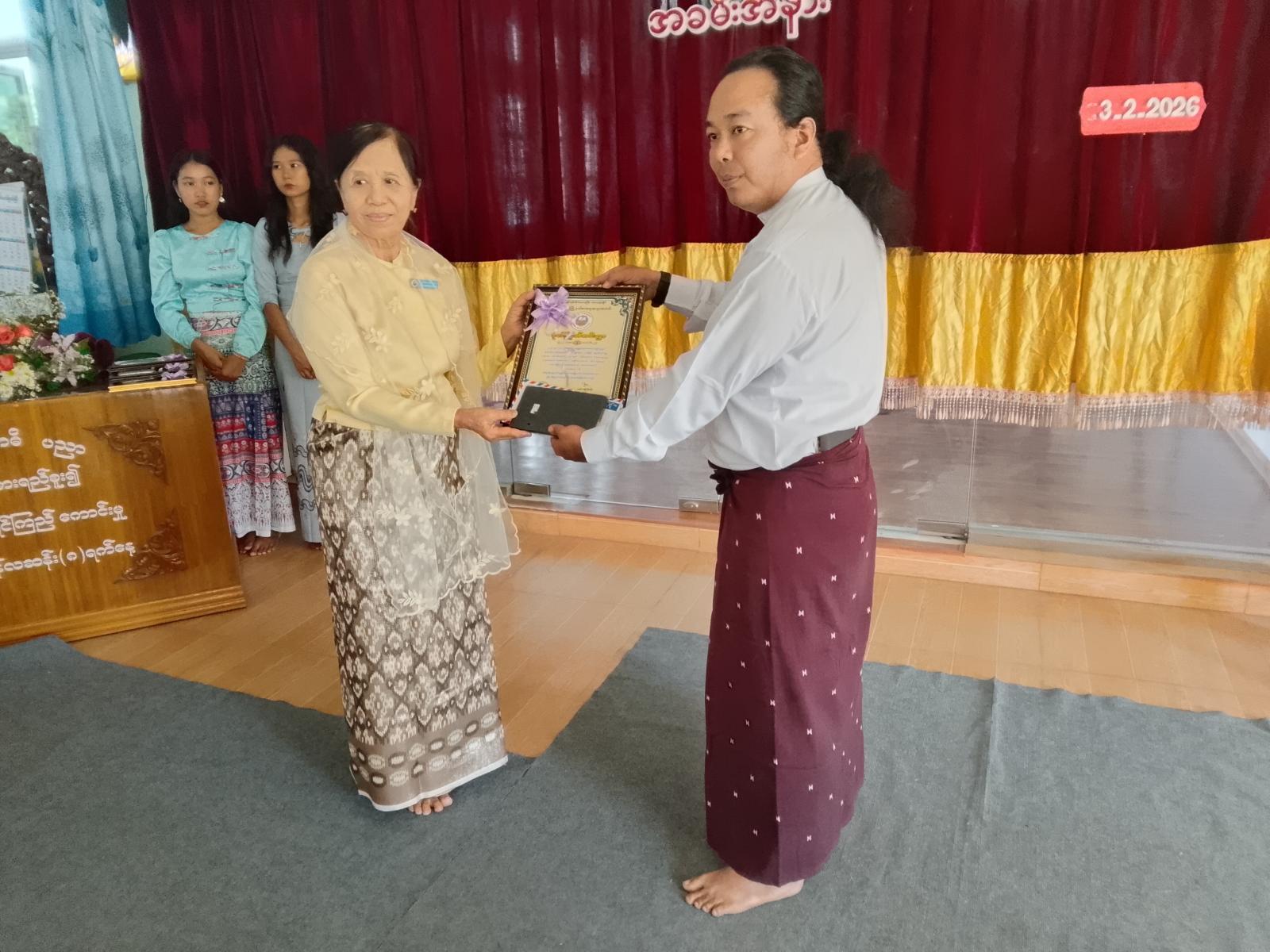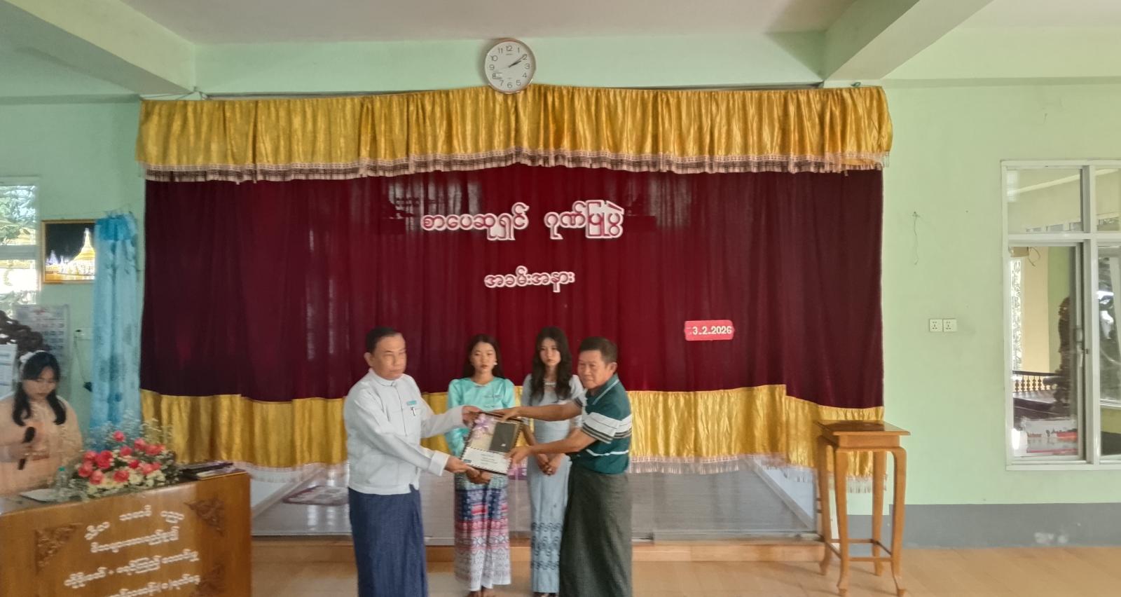 အခမ်းအနားတွင် ကျောင်းတိုက်၏ ဘဒါနနာယက ဆရာတော်မြို့နယ် သံဃာ့နာယကအတွင်းရေးမှူး ဘန္ဒတထာဝါရက မုဒိတာဩဝါဒမြွကြားပြီး မြို့နယ်ပြန်ကြားရေးနှင့်ပြည်သူ့ဆက်ဆံရေးဦးစီးဌာန ဦးစီးအရာရှိ သိန်းထွန်းအောင်က ဂုဏ်ပြုမုဒိတာ အမှာစကားပြောကြားခဲ့ကာ မြို့နယ်စာရေးဆရာအသင်း နာယကကြီး အောင်သူရိန် (ပုလဲ) က နှုတ်ခွန်းဆက်အမှာစကားပြောကြားခဲ့သည်။
