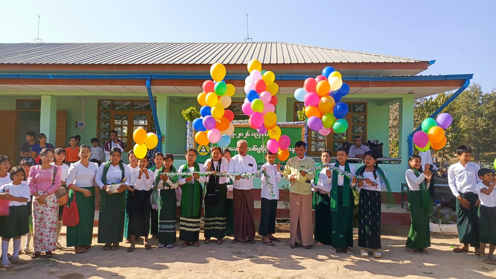 အခမ်းအနားတွင် မြို့နယ်စီမံခန့်ခွဲရေးနှင့်အုပ်ချုပ်ရေးကော်မတီဥက္ကဋ္ဌ ဦးမျိုးတင့်ထူးက အဖွင့်အမှာစကားပြောကြားပြီး၊ ဒုတိယမြို့နယ်ပညာရေးမှူး ဒေါ်ခင်သန္တာမိုးက ကျောင်းဆောင်သစ်ဆောက်လုပ်ရေးကိစ္စရပ်များနှင့်ပတ်သက်၍ ရှင်းလင်းပြောကြားခဲ့ရာ ကျောင်းအုပ်ဆရာမကြီးဒေါ် မေသူအေးက ကျောင်းသား/သူ မိဘများကိုယ်စား ကျေးဇူးတင်စကား ပြန်လည်ပြောကြားသည်။