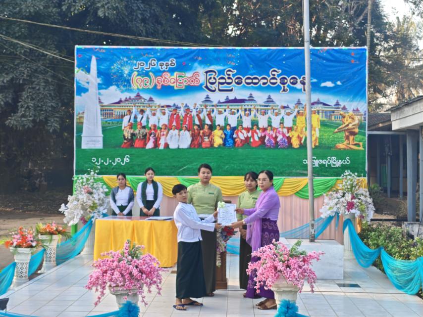ထို့နောက် ပြည်ထောင်စုနေ့အထိမ်းအမှတ် စာစီစာကုံး၊ ပန်းချီ၊ ကဗျာပြိုင်ပွဲတွင် ဆုရရှိခဲ့သော ကျောင်းသား၊ ကျောင်းသူများအား မြို့နယ်စီမံခန့်ခွဲရေးနှင့်အုပ်ချုပ်ရေးကော်မတီဥက္ကဋ္ဌနှင့် တာဝန်ရှိသူများမှ ဂုဏ်ပြုဆုများ အသီးသီးပေးအပ်ချီးမြှင့်ခဲ့ကြပြီး၊ အခမ်းအနားအပြီးတွင် ပြန်ကြားရေးနှင့်ပြည်သူ့ဆက်ဆံရေးဦးစီးဌာန ရုံးချုပ်မှပေးပို့သည့် (၇၉)နှစ်မြောက် ပြည်ထောင်စုနေ့အထိမ်းအမှတ် သတင်းစကားလက်ကမ်းစာစောင်ကို အခမ်းအနားသို့ တက်ရောက်လာသူများအား ဖြန့်ဝေပေးခဲ့ကြကြောင်း သိရသည်။