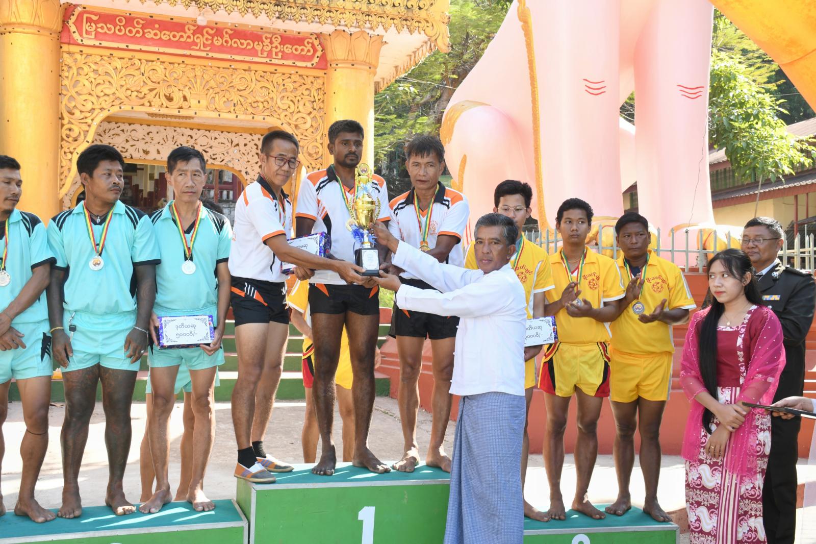 ယင်းနောက် ဆုချီးမြှင့်ပွဲကိုကျင်းပရာ ရိုးရာခြင်းလုံးအမှတ်ခတ်ပြိုင်ပွဲ၌ အနိုင်ရဗိုလ်စွဲခဲ့သည့် အသင်းအား သထုံခရိုင် စီမံခန့်ခွဲရေးနှင့်အုပ်ချုပ်ရေးကော်မတီဥက္ကဋ္ဌ ဦးစိုးအောင်က ဂုဏ်ပြုဆုနှင့် ဆုဖလားကို ချီးမြှင့်ပေးပြီး ခရိုင်စီမံခန့်ခွဲရေးနှင့်အုပ်ချုပ်ရေးကော်မတီဝင်များနှင့် တာဝန်ရှိသူတို့က ဒုတိယဆု၊ တတိယဆိုရရှိကြသည့် အသင်းတို့အား တစ်ဦးချင်းဂုဏ်ပြုဆုများကိုလည်းကောင်း သုံးမျိုးစုံအားကစားပြိုင်ပွဲ၌ ပထမဆု ဆွတ်ခူးရရှိသူအား ခရိုင်ရဲတပ်ဖွဲ့မှူး ဒုတိယရဲမှူး ကြီးမြင့်နိုင်က ဂုဏ်ပြုဆုနှင့် ဆုဖလား ချီးမြှင့်ပေးပြီး တာဝန်ရှိသူတို့က ဒုတိယ၊ တတိယနှင့် နှစ်သိမ့်ဆုရရှိကြသူတို့အားလည်းကောင်း အသီးသီးချီးမြှင့်ပေးခဲ့ကြသည်။