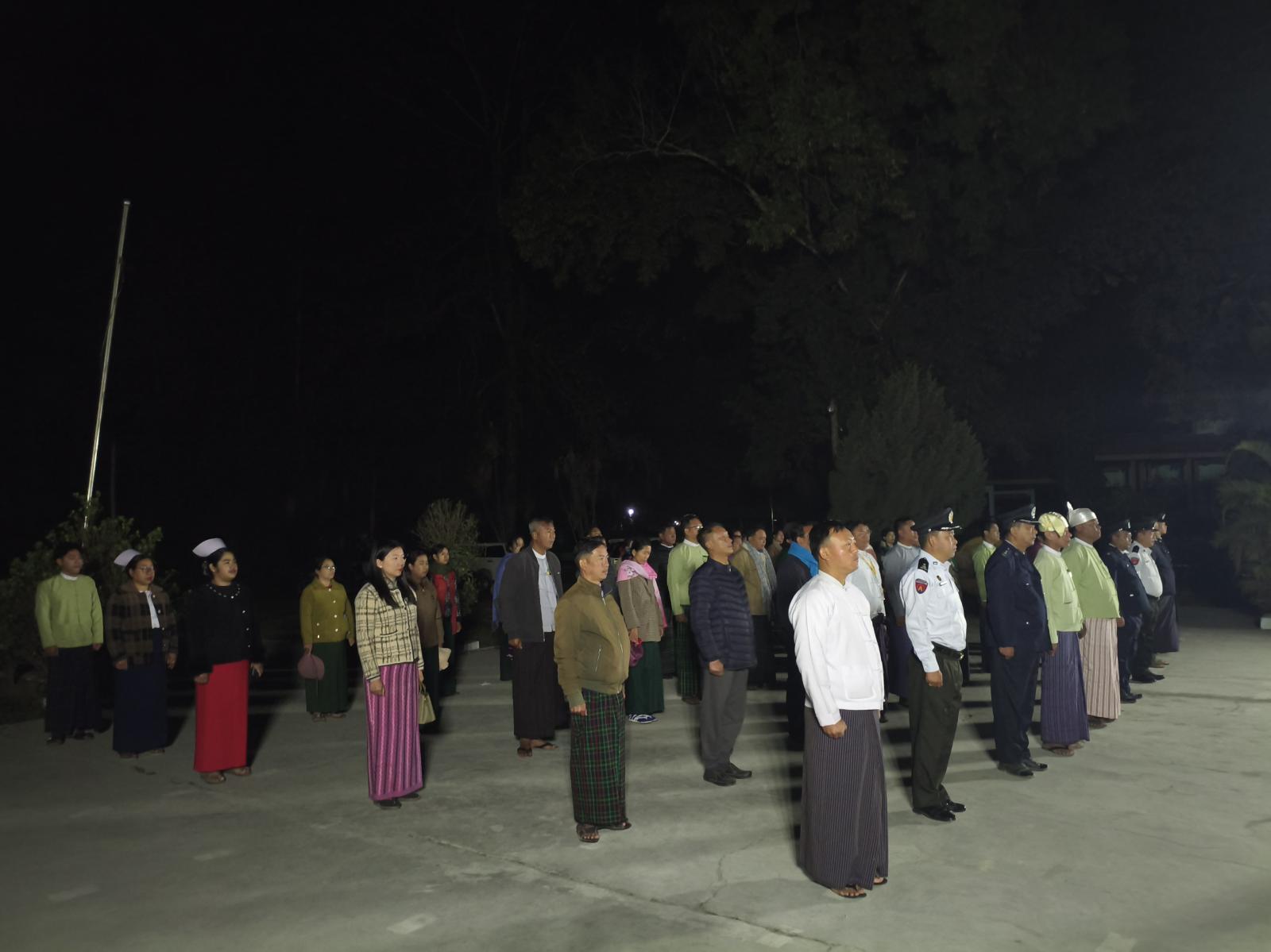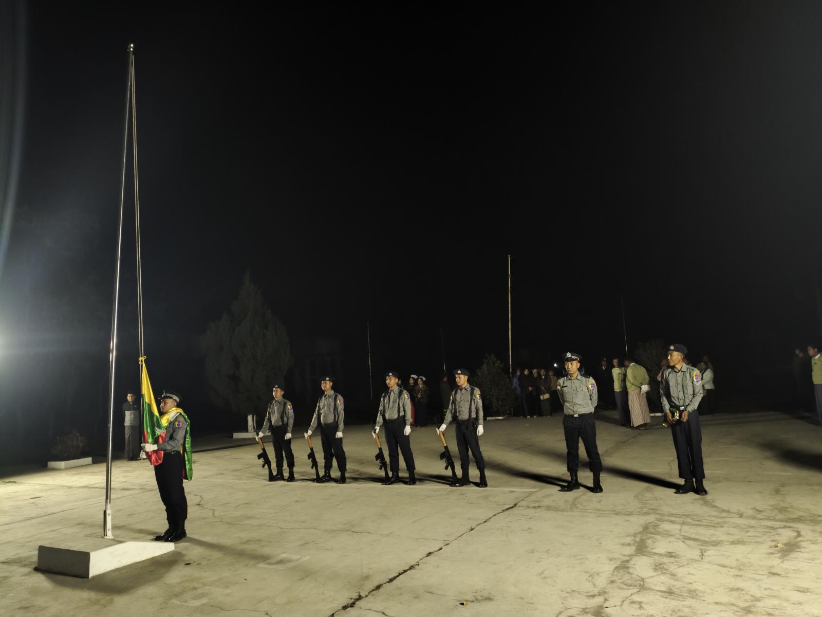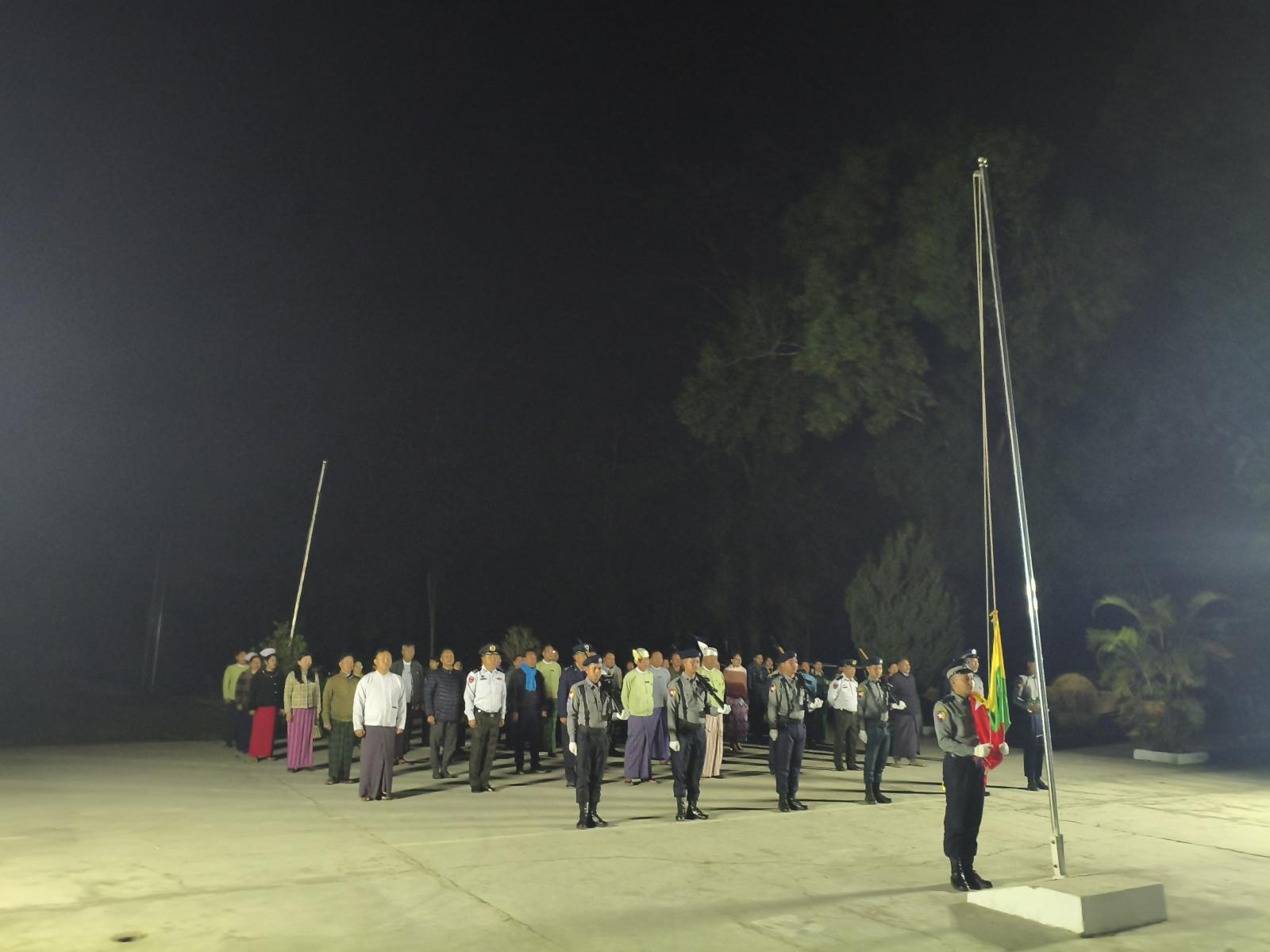 ရှေ့ဦးစွာ မြို့နယ်ရဲတပ်ဖွဲ့ဝင်များက ဦးဆောင်၍ မြန်မာနိုင်ငံတော်အလံအားလွင့်ထူပြီး ခရိုင်စီမံခန့်ခွဲရေးနှင့်အုပ်ချုပ်ရေးကော်မတီဥက္ကဋ္ဌ ဦးမိုးဇော်လင်းနှင့်အဖွဲ့ဝင်များ၊ မြို့နယ်စီမံခန့်ခွဲရေးနှင့် စီမံအုပ်ချုပ်ရေးကော်မတီဥက္ကဋ္ဌ ဦးအောင်စိုးနှင့်အဖွဲ့ဝင်များ၊ ဌာနဆိုင်ရာအကြီးကဲများနှင့် အဖွဲ့ဝင်များ၊ ဆရာ/ဆရာမများ အခမ်းအနားသို့ တက်ရောက်လာကြသူများက ပြည်ထောင်စုသမ္မတ မြန်မာနိုင်ငံတော်အလံအားလေးပြုခြင်းများ ဆောင်ရွက်ကြသည်။