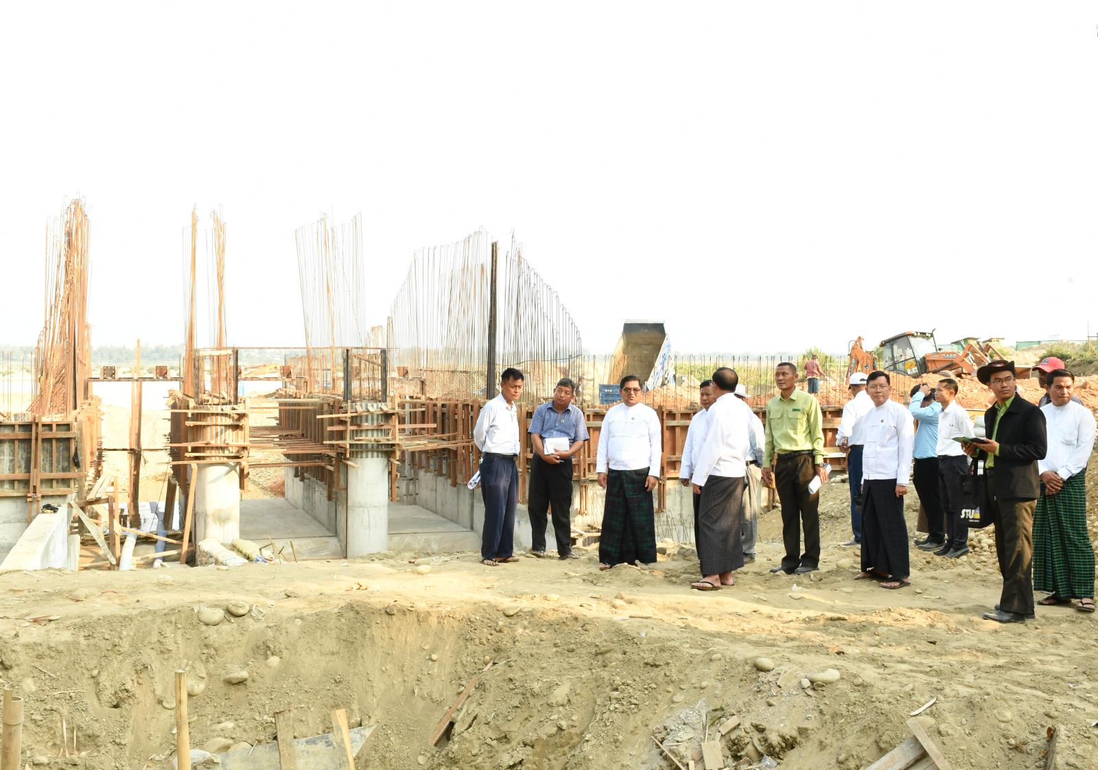ထို့နောက် ပြည်နယ်ဆည်မြောင်းနှင့် ရေအသုံးချမှုစီမံခန့်ခွဲရေးဦးစီးဌာနက ၂၀၂၅-၂၀၂၆ ဘဏ္ဍာရေးနှစ်၊ ပြည်နယ်ငွေလုံးငွေရင်းရန်ပုံငွေဖြင့် တာဝန်ယူတည်ဆောက်လျက်ရှိသော အင်ဂျန်းခ ချောင်းရေထိန်းတံခါး ၈ ပေ × ၁၂ ပေ တံခါး ၃ ပေါက်ပါဝင်သည့် ရေထိန်းတံခါးနှင့် ရေထိန်းတံခါးနှင့် ကပ်လျက်ပေ ၅၀ အတွင်း စက်ယန္တယားကြီးများနှင့် မြေသားတာဖို့ခြင်း လုပ်ငန်းဆောင်ရွက်နေမှုအခြေအနေများကိုလည်းကောင်း၊ ရေထိန်းတံခါးတည်ဆောက်နေမှုအခြေအနေများနှင့် ရေဝင်ပေါက်တူးဖော်ဆောင်ရွက်နေမှု အခြေအနေများကို လိုက်လံကြည့်ရှုစစ်ဆေးခဲ့ကြပြီး လုပ်ငန်းများ သတ်မှတ်ဒီဇိုင်းနှင့်အညီ စနစ်တကျ ဆောင်ရွက်နိုင်ရေး တာဝန်ရှိသူများနှင့် ညှိနှိုင်းပေါင်းစပ်ဆောင် ရွက်ပေးခဲ့သည်။