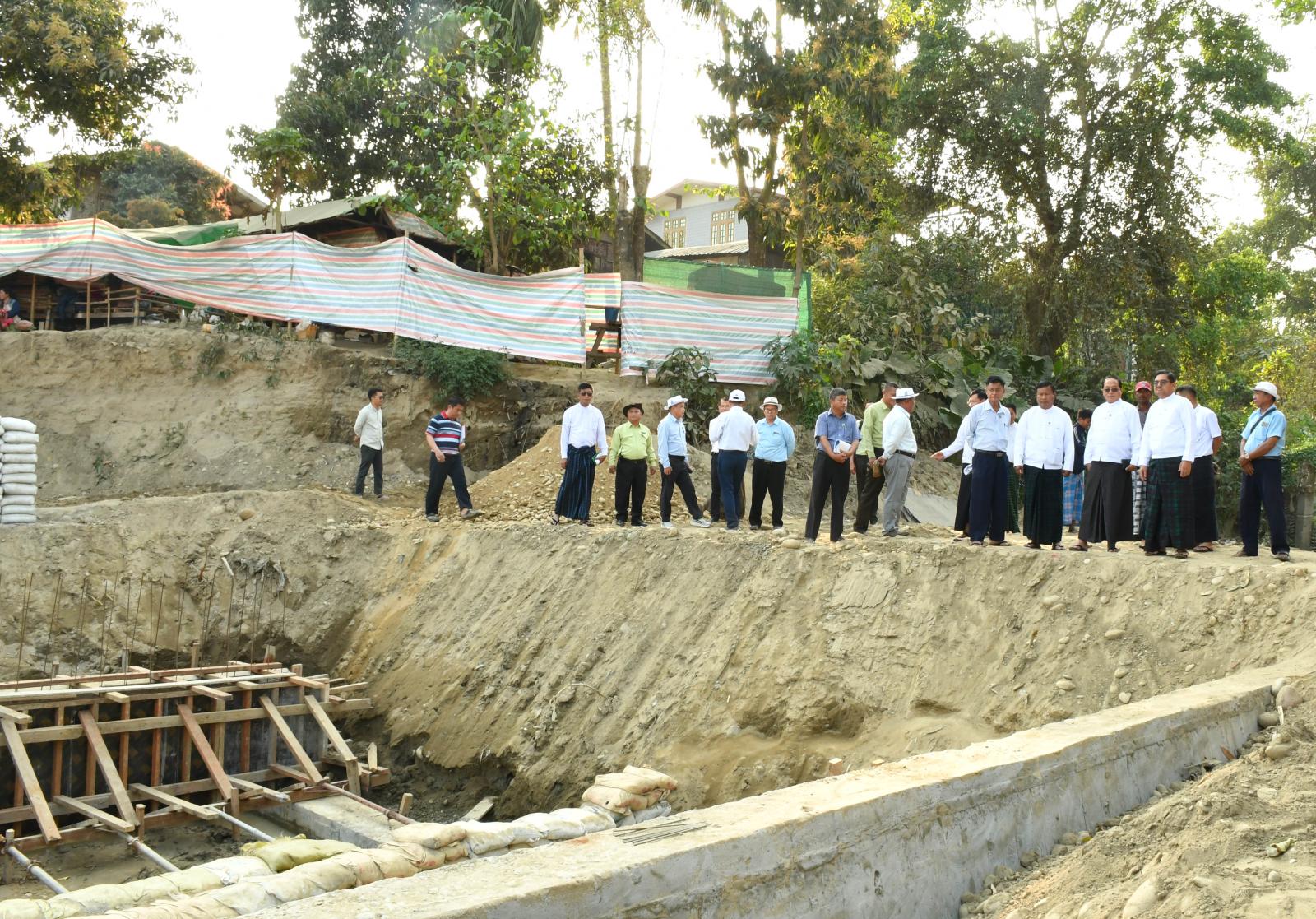 ကချင်ပြည်နယ်အစိုးရအဖွဲ့အနေဖြင့် မြစ်ကြီးနားမြို့ ရေကြီးရေလျှံမှုမှ ကာကွယ်နိုင်ရေးအတွက် ရေလမ်းကြောင်းဖွံ့ဖြိုးရေးလုပ်ငန်းများအပြင် အဓိကကျသည့် ရေလျှံတားကမ်းထိန်းတမံ တည်ဆောက်ရေးလုပ်ငန်းများအပြင် ရေထိန်းတံခါးများ တည်ဆောက်ခြင်းလုပ်ငန်းကို ဘဏ္ဍာနှစ်အလိုက် ဆောင်ရွက်လျက်ရှိရာ ပြည်နယ်ဝန်ကြီးချုပ် ဦးခက်ထိန်နန်သည် ယနေ့ညနေ ၃ နာရီခွဲက အင်ဂျန်းခချောင်းရေထိန်းတံခါး တည်ဆောက်ရေးလုပ်ငန်းများနှင့် မြေထိန်းတမံနှင့် ရေလျှံတားနံရံ တည်ဆောက်ရေးလုပ်ငန်းများအား ကွင်းဆင်းစစ်ဆေးခဲ့သည်။