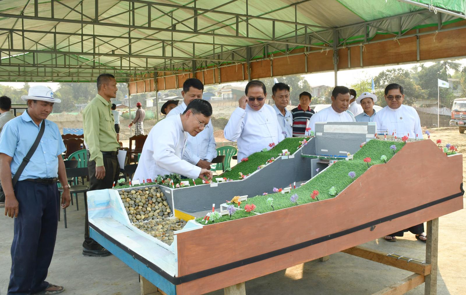 ထိုသို့ ကွင်းဆင်းစစ်ဆေးရာတွင် ပြည်နယ်ဝန်ကြီးချုပ်သည် ပြည်နယ်အစိုးရအဖွဲ့ဝင်ဝန်ကြီးများ၊ ပြည်နယ်အဆင့် ဌာနဆိုင်ရာတာဝန်ရှိသူများနှင့်အတူ မြစ်ကြီးနားမြို့ စီတာပူရပ်ကွက်အတွင်း ဧရာဝတီမြစ်ကမ်းပါးသို့သွားရောက်ပြီး အဆိုပါရပ်ကွက်အတွင်း ရေအရင်းအမြစ်နှင့် မြစ်ချောင်းများ ဖွံ့ဖြိုးတိုးတက်ရေးဦးစီးဌာနက တာဝန်ယူတည်ဆောက်လျက်ရှိသော ကျောက်စီမြေထိန်းတမံနှင့် ရေလျှံတားနံရံတည်ဆောက်နေမှု အခြေအနေများကို ကြည့်ရှုစစ်ဆေးခဲ့ကြသည်။