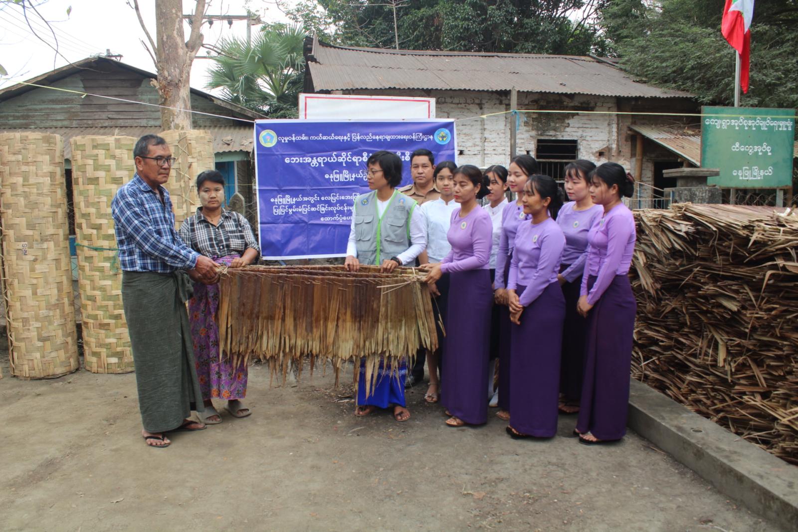 ထိုသို့ပေးအပ်ရာတွင် မြို့နယ်စီမံခန့်ခွဲရေးနှင့် အုပ်ချုပ်ရေးကော်မတီဥက္ကဋ္ဌ ဦးကျော်မိုးလွင်က အမှာစကားပြေားကြားပြီး၊ မြို့နယ်ဘေးအန္တရာယ်ဆိုင်ရာစီမံခန့်ခွဲမှုဦးစီးဌာနမှ မြို့နယ်ဦးစီးမှူး ဒေါ်ခြူးရွှေစင်က လေပြင်းဘေးကြိုတင်ကာကွယ်ရေးနှင့်ပတ်သက်၍ အသိပညာပေးပြောကြား ခဲ့သည်။ ထို့နောက် မြို့နယ်ဘေးအန္တရာယ်ဆိုင်ရာစီမံခန့်ခွဲမှုဦးစီးဌာနမှ မြို့နယ်ဦးစီးမှူး ဒေါ်ခြူးရွှေစင်နှင့်တာဝန်ရှိသူများ၊ ကျေးရွာအုပ်ချုပ်ရေးအဖွဲ့နှင့် လူမှုရေးအသင်းအဖွဲ့များက မိုးဦးကာလများဖြစ်သည့် ဧပြီလနှင့် မေလများ၌ နှစ်စဉ်ဖြစ်ပွားလျက်ရှိသော လေပြင်းဘေး အန္တရာယ်နှင့်ပတ်သက်၍ လေပြင်းဒဏ်ခံနိုင်သော ရပ်ရွာအသိုက်အဝန်းတစ်ခုဖြစ်စေရန်ရည်ရွယ်၍ လေပြင်းဘေး ကြိုတင်ပြင်ဆင်နိုင်ရေး အိုးအိမ်များပြင်ဆင်မွမ်းမံနိုင်ရန်အတွက် အိမ်ဆောက်ပစ္စည်းများ ဖြစ်သည့် ထရံ၊ ဓနိများအားပေးအပ်ခဲ့သည်။