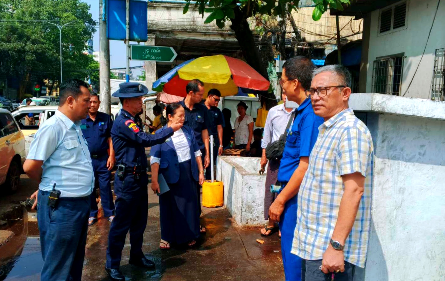 အဆိုပါကွင်းဆင်းစစ်ဆေးရာသို့ မြို့နယ်စီမံခန့်ခွဲရေးနှင့်အုပ်ချုပ်ရေးကော်မတီဥက္ကဋ္ဌ ဦးရန်နိုင်ဝင်း၊ ကျောက်တံတားခရိုင် မီးသတ်မှ ဦးစီးမှူး ဦးမျိုးမင်းထက်၊ ကျောက်တံတားခရိုင် စည်ပင်သာယာစျေးများရုံးမှ တာဝန်ခံအရာရှိ၊ လသာမြို့နယ်လျှပ်စစ်ရုံးမှ တာဝန်ရှိသူများ၊ ရပ်ကွက်အုပ်ချုပ်ရေးမှူးနှင့် စျေးတာဝန်ခံပါဝင်သော ပူးပေါင်းအဖွဲ့များဖြင့် အပေါ့မီးသတ်စက် စမ်းသပ်မောင်းနှင်ခြင်း၊ မြေအောက်ဓါတ်အားခွဲရုံစစ်ဆေးခြင်း၊ ရေလှောင်ကန်နှင့် မီးသတ်ရေလှောင်ကန်နှင့် မီးဘေးကာကွယ်ရေးလုပ်ငန်းများ ဆောင်ရွက်ထားရှိမှုအား သွားရောက်ကွင်းဆင်းစစ်ဆေးခဲ့ကြောင်း သိရသည်။