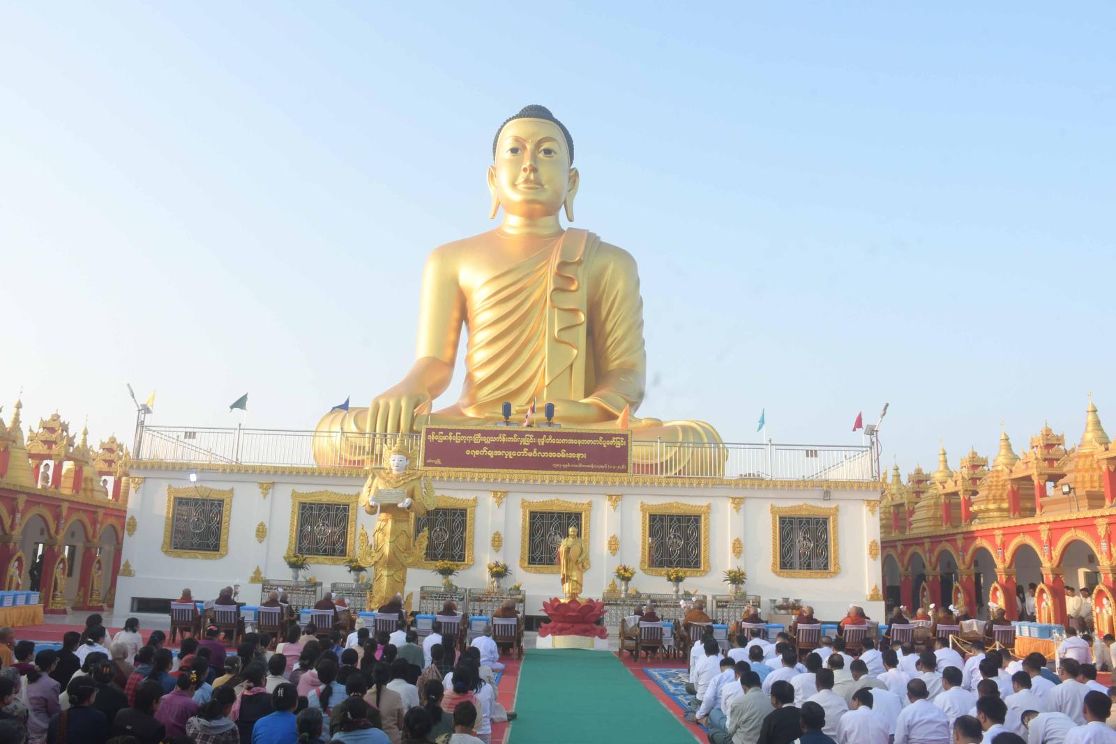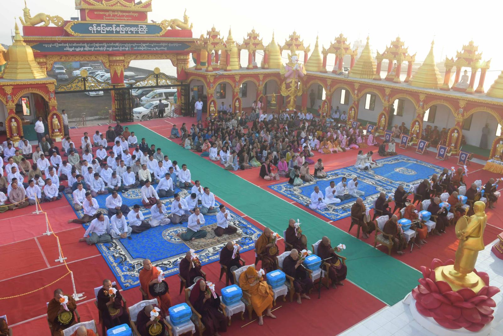 စစ်တွေမြို့၊ ရန်ပြေမာန်ပြေဘုရားကြီးအား ရွှေသင်္ကန်းကပ်လှူခြင်း၊ ဗုဒ္ဓါဘိသေက အနေကဇာတင်ပူဇော်ခြင်း၊ ရေစက်ချအလှူတော်မင်္ဂလာအခမ်းအနားကို ယနေ့နံနက်ပိုင်းက အဆိုပါဘုရားကြီးရင်ပြင်တော်၌ကျင်းပရာ ပြည်နယ်ဩဝါဒါစရိယ ဆရာတော်ကြီးများ၊ သံဃာတော်အရှင်သူမြတ်များ၊ ရခိုင်ပြည်နယ်ဝန်ကြီးချုပ် ဦးထိန်လင်း၊ အနောက်ပိုင်းတိုင်းစစ်ဌာနချုပ် တိုင်းမှူး၊ ဗိုလ်ချုပ်ကျော်စွာဦး၊ ပြည်နယ်တရားလွှတ်တော်တရားသူကြီးချုပ်၊ စစ်တွေတပ်နယ်မှ တပ်မတော်အဆင့်မြင့်အရာရှိကြီးများ၊ ပြည်နယ်အစိုးရအဖွဲ့ဝင်များနှင့် ဇနီးများ၊ ဌာနဆိုင်ရာများနှင့် ဖိတ်ကြားထားသူများ တက်ရောက်ကြသည်။