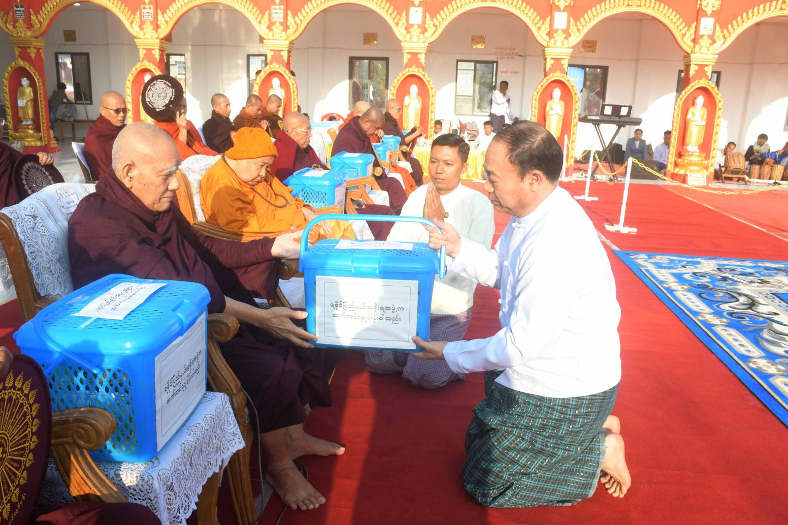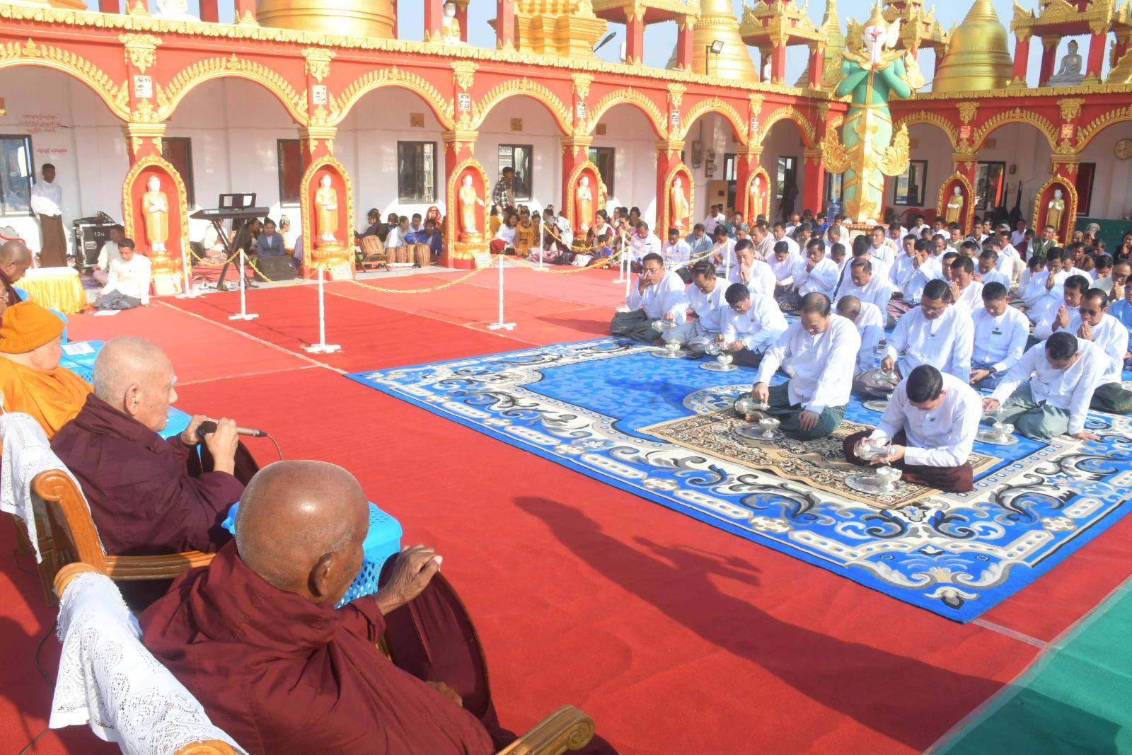 ယင်းနောက် ပြည်နယ်ဩဝါဒါစရိယ၊ စစ်တွေမြို့၊ နန္ဒာရာမပရိယတ္တိစာသင်တိုက် ပဓာနနာယက၊ အဂ္ဂမဟာပဏ္ဍိတ၊ အဘိဓဇမဟာရဋ္ဌဂုရု ဘဒ္ဒန္တနန္ဒသိရီ မဟာထေရ်မြတ်ထံမှ ပြည်နယ်ဝန်ကြီးချုပ်အမှူးပြုသော ဧည့်ပရိတ်သတ်များက ငါးပါးသီလခံယူဆောက်တည်ကြပြီး ပြည်နယ်ဝန်ကြီးချုပ် ဦးထိန်လင်း၊ တိုင်းမှူး၊ ပြည်နယ်တရားလွှတ်တော်တရားသူကြီးချုပ်၊ ပြည်နယ်အစိုးရအဖွဲ့ဝင်များနှင့် ဌာနဆိုင်ရာတာဝန်ရှိသူများက သံဃာတော်အရှင်သူမြတ်များအား လှူဖွယ်ပစ္စည်းများ ဆက်ကပ်လှူဒါန်းကြသည်။