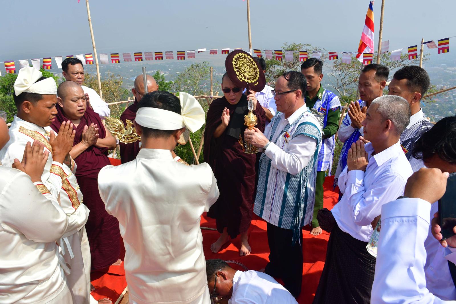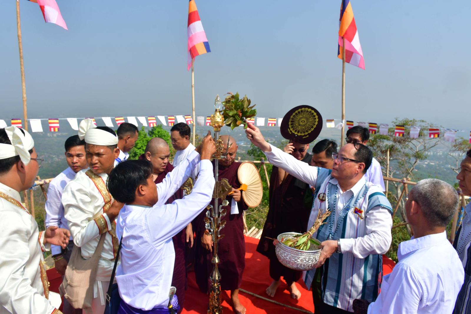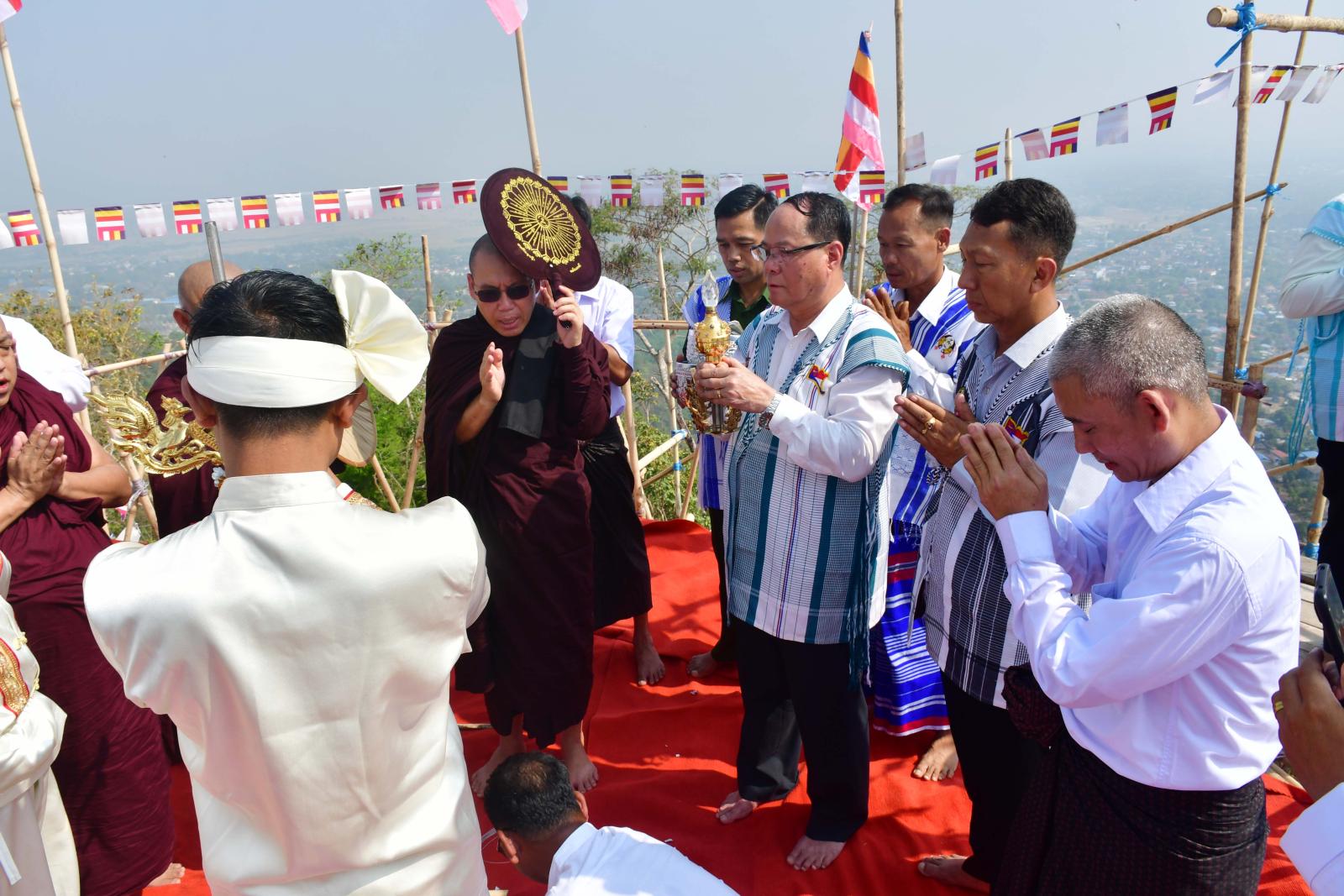 ယင်းနောက် စေတီတော်တည်ထားရာတွင်လည်းကောင်း၊ ရွှေထီးတော်တင်လှူပူဇော်ရာတွင်လည်းကောင်း မှားယွင်းခြင်း၊ လစ်ဟာခြင်း၊ မပြည့်စုံချင်းများရှိခဲ့ပါက တောင်းပန်လွှာကို အခမ်းအနားမှူးက ဖတ်ကြားတောင်းပန်ပြီး ပြည်နယ်ဝန်ကြီးချုပ်၊ တာဝန်ရှိသူများနှင့် အလှူရှင်မိသားစုတို့က သံဃာတော်အရှင်သူမြတ်များအား လှူဖွယ်ဝတ္ထုပစ္စည်းများနှင့် နဝကမ္မအလှူငွေများ ဆက်ကပ်လှူဒါန်းကြကာ နောင်လုံဌာန်ပတိုင်ကျောင်းဆရာတော်ထံမှ အနုမောဒနာတရားနာကြား၍ လှူဒါန်းမှုအစုစုတို့အတွက် ရေစက်သွန်းချအမျှပေးဝေခဲ့ကြသည်။