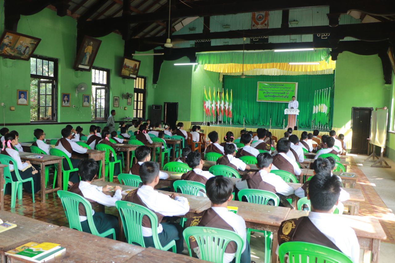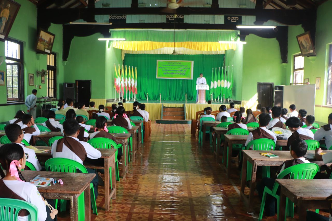 မွန်ပြည်နယ် အထွေထွေအုပ်ချုပ်ရေးဦးစီးဌာန၊ အခြေခံပညာဦးစီးဌာနနှင့် ဗုဒ္ဓဘာသာကလျာဏယုဝအသင်းတို့ ပူးပေါင်းဖွင့်လှစ်သည့် (၃၈)ဖြာမင်္ဂလာတရားတော်နှင့် ဗုဒ္ဓဝင်အခြေခံသင်တန်းဖွင့်ပွဲအခမ်းအနားကို ယနေ့နံနက်ပိုင်းက မော်လမြိုင်မြို့ အမှတ်(၁) အခြေခံပညာအထက်တန်းကျောင်း စိန်ရတုခန်းမ၌ ကျင်းပပြုလုပ်သည်။