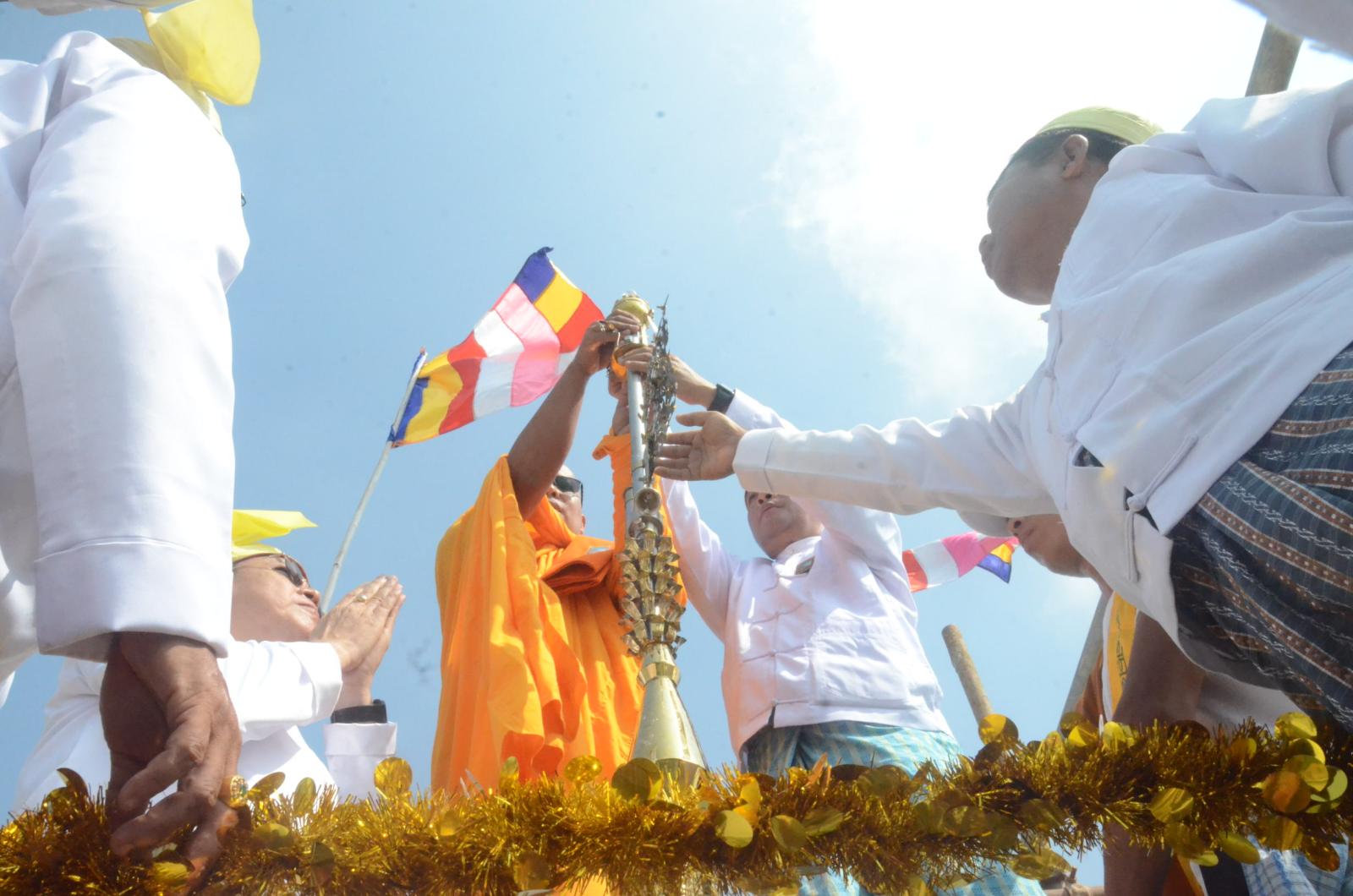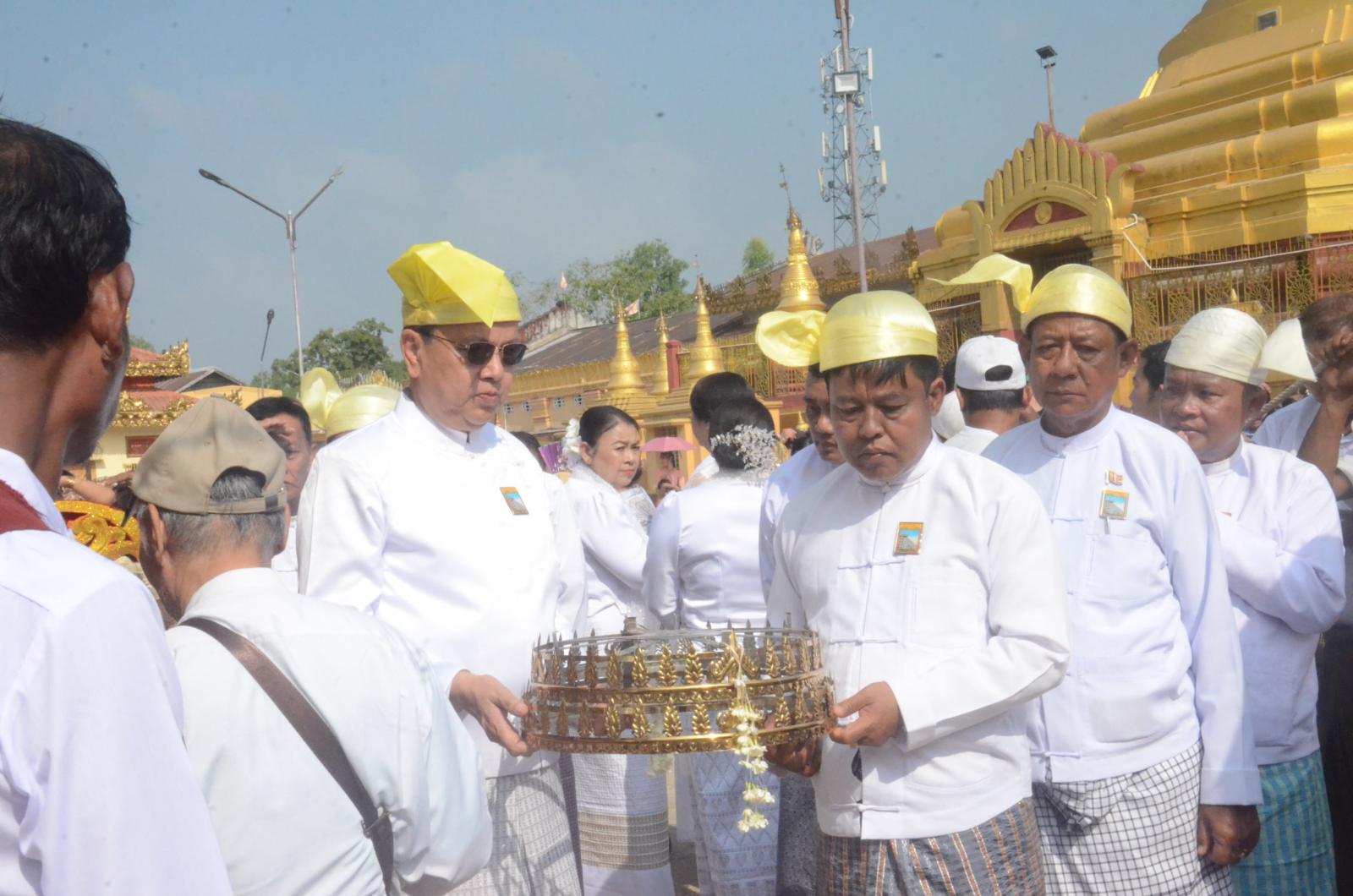တာဝတိံသာစေတီတော်မြတ်ကြီး၏ အထက်ဌာပနာတော်သွင်းလှူခြင်း၊ အထွဋ်စေတီတော်အား ရွှေထီးတော်တင်လှူခြင်းနှင့် ဗုဒ္ဓဘိသေက အနေကဇာတင်လှူခြင်း အခမ်းအနားသို့ စေတီတော်တည်ဆောက်ရေး အကျိုးတော်ဆောင် ဆရာတော်၊ သံဃာတော်ကြီးများ၊ မြို့နယ်စီမံခန့်ခွဲရေးနှင့် အုပ်ချုပ်ရေးကော်မတီဥက္ကဋ္ဌ၊ ဦးဇော်ဝင်းလှိုင်နှင့် ကော်မတီဝင်များ၊ ဌာနဆိုင်ရာများ၊ စေတီတော်တည်ဆောက်ရေး ကော်မတီဝင်များနှင့် အကျိုးတော်ဆောင်များ၊ သာသနာ့ ဒါယကာ/ဒါယကာမများ တက်ရောက်ကြပြီး အခမ်းအနားအား နမောတဿ (၃)ကြိမ်ရွတ်ဆိုဖွင့်လှစ်ခဲ့သည်။