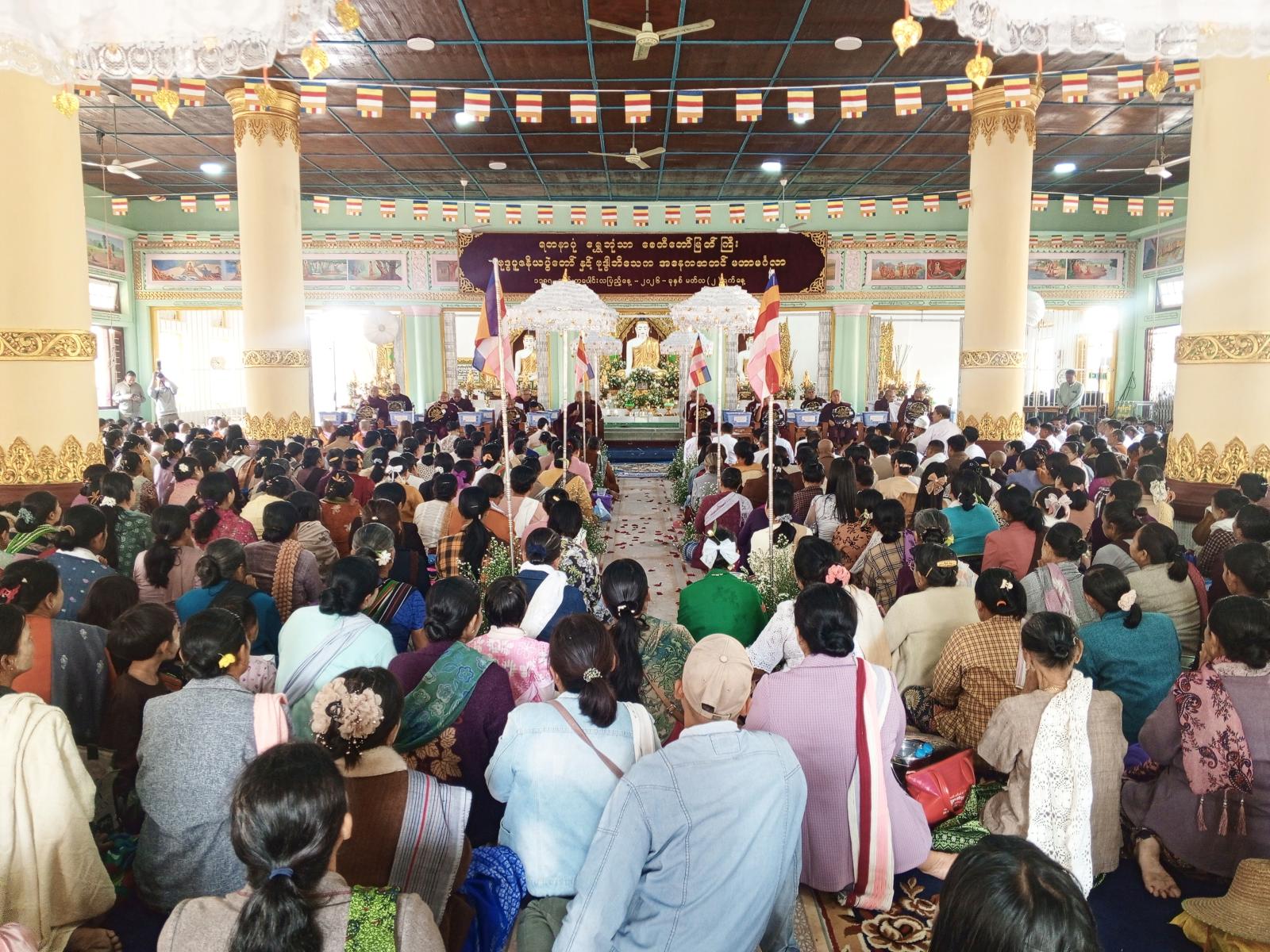 ဆက်လက်၍ ရွှေဘုံသာစေတီတော်မြတ်ကြီးဓမ္မာရုံအတွင်း၌ သံဃာတော်အရှင်သူမြတ်များနှင့် တက်ရောက်လာသူမျာက နမောတဿ သုံးကြိမ်ရွတ်ဆို ဘုရားကန်တော့၍ အခမ်းအနား ဖွင့်လှစ်ခဲ့ပြီး အဂ္ဂမဟာဂန္ဓဝါစကပဏ္ဍိတ၊ တောင်ဖီလာ ဆရာတော် ဘဒ္ဒန္တရာဇိန္ဒထံမှ ကိုးပါးသီလ ခံယူဆောက်တည်ကြပြီး ဒေသကွပ်ကဲမှူစစ်ဌာနချုပ်(ကလေး)မှ ဒေသကွပ်ကဲရေးမှူး၏ဇနီး၊ ကလေးခရိုင်စီမံခန့်ခွဲရေးနှင့် အုပ်ချုပ်ရေးအဖွဲ့ဥက္ကဋ္ဌ ဦးမိုးထက်နှင့် အဖွဲ့ဝင်များ၊ ဌာနဆိုင်ရာတာဝန်ရှိသူများက ဆရာတော်၊ သံဃာတော်များထံ လှူဖွယ်ဝတ္တုပစ္စည်းများကို ဆက်ကပ်လှူဒါန်းခဲ့ကြသည်။ ယင်းနောက် ဒေသကွပ်ကဲမှူစစ်ဌာနချုပ်(ကလေး)မှ ဒေသကွပ်ကဲရေးမှူက သာသနာရေးဆိုင်ရာများ လျောက်ထားခဲ့သည်။ ရွှေဘုံသာစေတီတော်မြတ်ကြီးဘဏ္ဍာတော်ထိန်း ဂေါပကအဖွဲ့မှ ဦးဆောင်ဘုရားဒါယကာမိသားစုနှင့် ဗိသုကာပညာရှင်များအား ဂုဏ်ပြုမှတမ်းလွှာများ ပေးအပ်ခဲ့သည်။