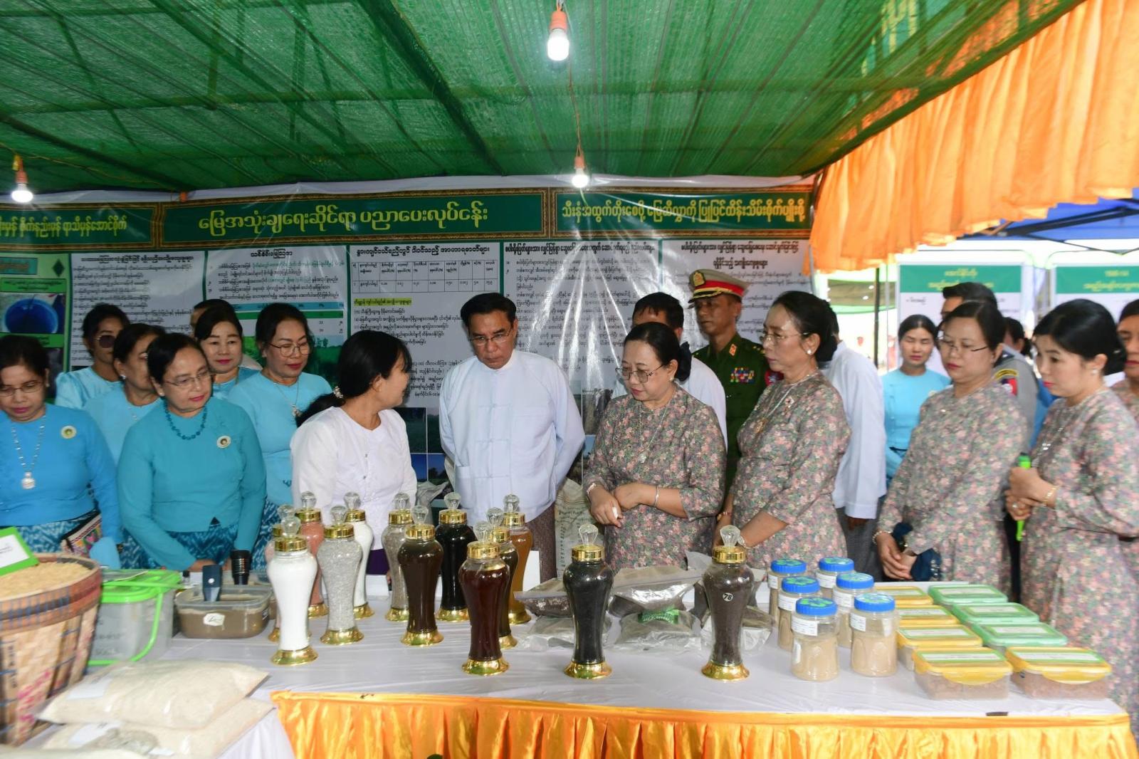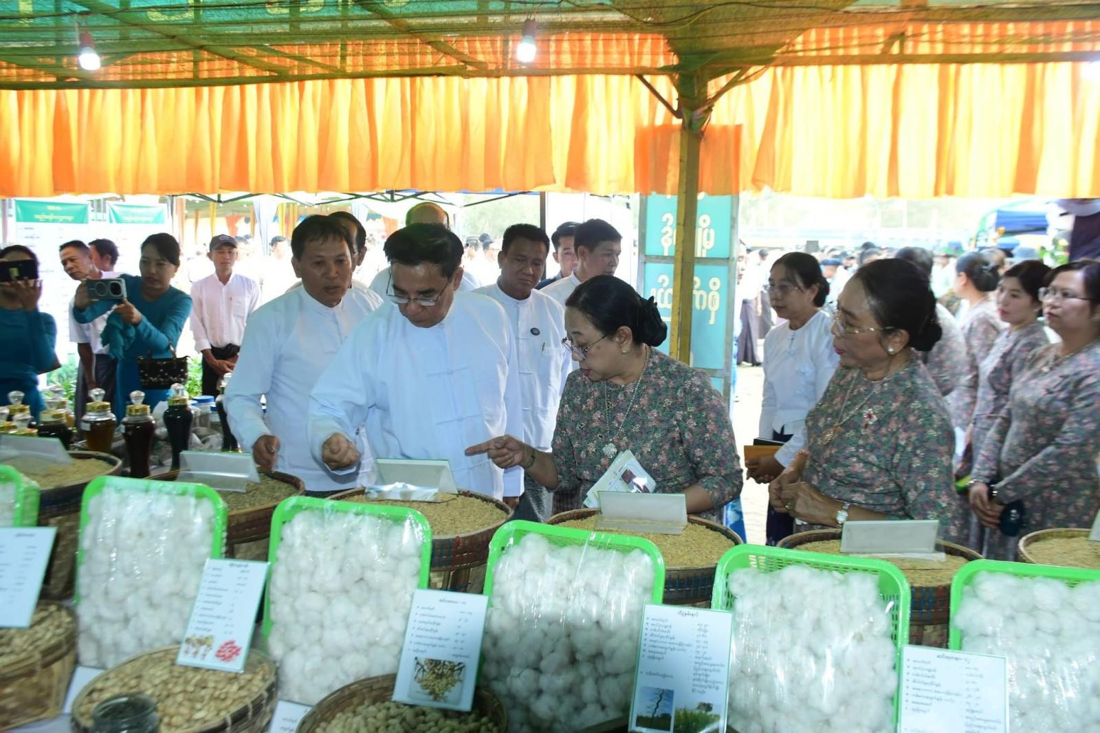 ထို့နောက် တိုင်းဒေသကြီး ဝန်ကြီးချုပ်၊ တိုင်းဒေသကြီး ဝန်ကြီးများနှင့် တာဝန်ရှိသူများက ပဲခူးခရိုင်၊ ညောင်လေးပင်ခရိုင်၊ တောင်ငူခရိုင်၊ ပြည်ခရိုင်၊ နတ်တလင်းခရိုင်နှင့် သာယာဝတီခရိုင် တို့မှ ဒေသထွက်သစ်သီးဝလံပန်းမန် ပြိုင်ပွဲဝင်သစ်သီးဝလံပန်းမန်များ ခင်းကျင်းပြသထားရှိမှု၊ လယ်ယာသုံးစက်ကိရိယာပြခန်း၊ မွေးမြူရေးဆိုင်ရာပြခန်းများ၊ ဌာနဆိုင်ရာအသိပညာပေးပြခန်းများ၊ မွေးမြူရေးစံပြခြံများ၊ ဒေသထွက်ကုန်အရောင်းပြခန်း စုစုပေါင်း ပြခန်း (၁၁၀)ကျော် ပြသထားမှုကို လှည့်လည်ကြည်ရှုအားပေးခဲ့ပြီး ဒေသထွက်ကုန်များအား နိုင်ငံစီးပွား မြှင့်တင်ရေးရန်ပုံငွေဖြင့် တန်ဖိုးမြှင့်ထုတ်ကုန်အဖြစ် တိုးတက်ထုတ်လုပ်နိုင်ရေး၊ ပြည်ပပို့ကုန်အဆင့်ထိမျှော်မှန်းထုတ်လုပ်ဆောင်ရွက်ရန်နှင့် ဒေသတွင်းစိုက်ပျိုးရေးနှင့် မွေးမြူရေးလုပ်ငန်းများ တိုးချဲ့ဆောင်ရွက်နိုင်ရေး တာဝန်ရှိသူများနှင့် ပေါင်းစပ်ညှိနှိုင်း ဆောင်ရွက်ပေးသည်။