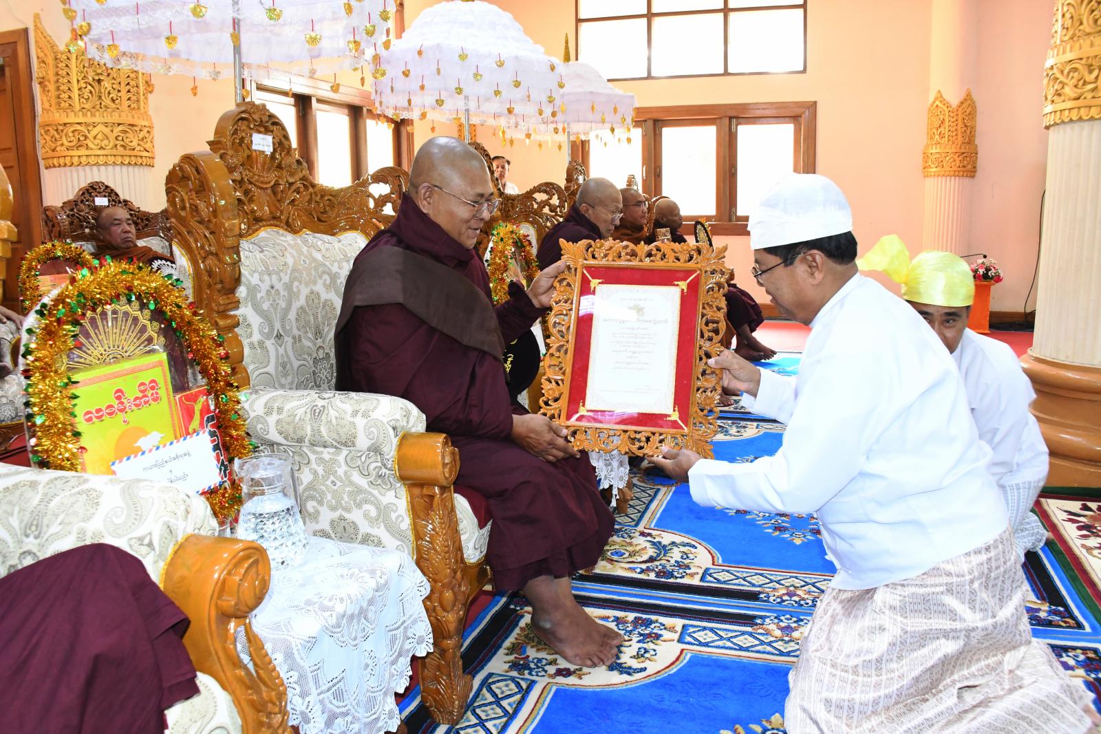 ဆက်လက်၍ ပြည်နယ်ဝန်ကြီးချုပ်က သာသနာရေးဆိုင်ရာများ လျှောက်ထားပြီး ပြည်နယ်ဝန်ကြီးချုပ်နှင့် တာဝန်ရှိသူများက မဟာသဒ္ဓမ္မဇောတိကဓဇ၊ သဒ္ဓမ္မဇောတိကဓဇ ဘွဲ့တံဆိပ်တော်ရ ဘွဲ့ခံဆရာတော် (၅) ပါးတို့အား အဆောင်အယောင်များနှင့် လှူဖွယ်ဝတ္ထု ပစ္စည်းများအားလည်းကောင်း၊ ပင့်သံဃာတော်ဆရာတော် (၁၃) ပါးအား လှူဖွယ်ဝတ္ထု ပစ္စည်းများအားလည်းကောင်း ဆက်ကပ်လှူဒါန်းကာ လူပုဂ္ဂိုလ်တစ်ဦးအား သုဓမ္မသိင်္ဂီ ဘွဲ့တံဆိပ်တော် ပေးအပ်သည်။ ထို့နောက် ပြည်နယ်သံဃနာယကအဖွဲ့ အကျိုးတော်ဆောင် လွိုင်ကော်မြို့ ရွှေကျောင်းဆရာတော် ဘဒ္ဒန္တသီဟနန္ဒ (မဟာသဒ္ဓမ္မ ဇောတိကဓဇ) ထံမှ အနုမောဒနာတရားနာကြား၍ ရေစက်သွန်းချ အမျှပေးဝေကြသည်။