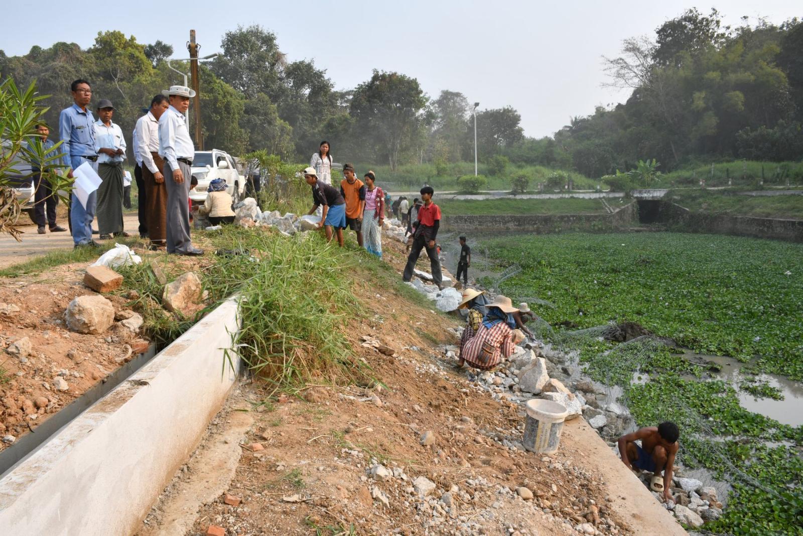ထို့နောက် နေပြည်တော်ကောင်စီဥက္ကဋ္ဌသည် ၂၀၂၅-၂၀၂၆ ဘဏ္ဍာရေးနှစ်၊ အမျိုးသားသဘာဝဘေး အန္တရာယ်ဆိုင်ရာစီမံခန့်ခွဲမှုရန်ပုံငွေဖြင့် ငလျင်ဘေးကြောင့် ထိခိုက်ပျက်စီးခဲ့သည့် ဇမ္ဗူသီရိမြို့နယ်၊ ပျဉ်းမနား-တောင်ညိုလမ်းဘေးရှိ မင်္ဂလာကန် အမှတ်(၁)၊(၂)၊(၃) ပြန်လည်ပြုပြင်နေမှု အခြေအနေများကို ကြည့်ရှုစစ်ဆေးရာ တာဝန်ရှိသူများမှ ကျောက်စီမြေထိန်းနံရံများပြုပြင်ခြင်း၊ မြေထိန်းနံရံများ ထောက်ကန်မှု အားကောင်းစေရန်အတွက် Gabion ကျောက်ခြင်းချဆောင်ရွက်ခြင်းများကို ရှင်းလင်းတင်ပြခဲ့ရာ နေပြည်တော်ကောင်စီဥက္ကဋ္ဌက လုပ်ငန်းများအားလုံး သတ်မှတ်ချိန်အတွင်း ပြီးစီးအောင် ဆောင်ရွက်ရန်၊ အရည်အသွေးပြည့်မီသည့် ကျောက်များကို ရွေးချယ်အသုံးပြုသွားရန်၊ ကန်အတွင်းရှိ ဗေဒါများကိုပါ တစ်ပါတည်း ဆယ်ယူရှင်းလင်းဆောင်ရွက်ရန်နှင့် ကန်ပတ်ဝန်းကျင် သန့်ရှင်းသာယာလှပရေး အမြဲမပျက်ဆောင်ရွက်သွားရန် မှာကြားခဲ့သည်။