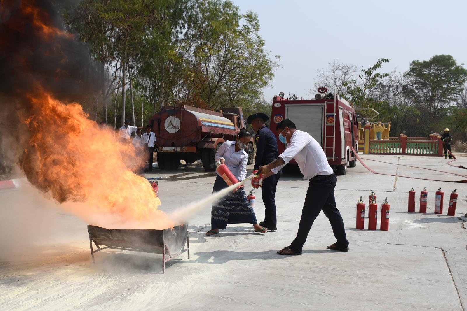 ဆက်လက်၍ မီးသတ်တပ်ဖွဲ့ဝင်များက မီးသတ်ဆေးဗူးအသုံးပြု၍ မီးငြိမ်းသတ်နည်းများကို ရှင်းလင်းပြောကြားကာ စက်ရုံဝန်ထမ်းများအား မီးငြိမ်းသတ်ခြင်းကို လက်တွေ့လေ့ကျင့်စေခြင်း၊ မီးသတ်ပိုက်များအသုံးပြု၍ မီးငြိမ်းသတ်နည်းများကို စက်ရုံဝန်ထမ်းများနှင့်အတူ ပူးတွဲလေ့ကျင့်ပြသပေးခဲ့ကြပြီး စက်ရုံအတွင်းမီးဘေးအန္တရာယ် ကာကွယ်ရေးအတွက် ရေသိုလှောင်ထားမှု၊ မီးငြိမ်းသတ်ရေးပစ္စည်းများ အသင့်ထားရှိမှုတို့ကို လိုက်လံကြည့်ရှုခဲ့ကြောင်း သိရသည်။