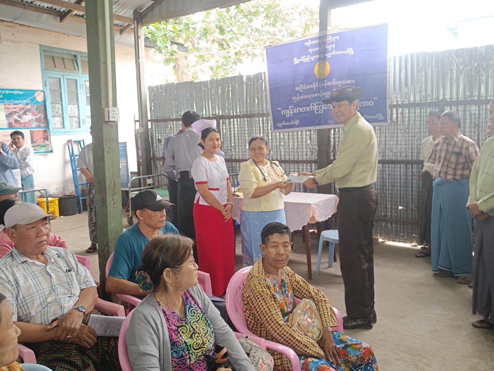 ရှေးဦးစွာ ကျန်းမာရေးစောင့်ရှောက်မှုခံယူနေသော အငြိမ်းစားနိုင်ငံ့ဝန်ထမ်းများအား ခရိုင်စီမံခန့်ခွဲရေးနှင့်အုပ်ချုပ်ရေးကော်မတီဥက္ကဋ္ဌ ဦးအောင်ကျော်စိုးနှင့်အဖွဲ့ဝင်များ၊ မြို့နယ်စီမံခန့်ခွဲရေးနှင့်အုပ်ချုပ်ရေးကော်မတီဥက္ကဋ္ဌ ဦးရာဇာမြင့်နှင့်အဖွဲ့ဝင်များ၊ ကွယ်လွန်သူ ဖခင်ကြီးဦးမောင်မောင်ကြီးအားရည်စူး၍ ကျန်ရစ်သူမိသားစုဝင်ဆေးအလှူရှင်များ၊ ရွှေလုပ်ငန်းရှင်များအသင်းအလှူရှင်များ၊ ဆေးနှင့်ဆေးပစ္စည်းအလှူရှင်မိသားစုဝင်များနှင့် မြို့မိမြို့ဖများမှစုပေါင်း၍ ဆေးနှင့်ဆေးဝါးများ ဝိုင်းဝန်းထောက်ပံ့ပေးခဲ့ကြသည်။