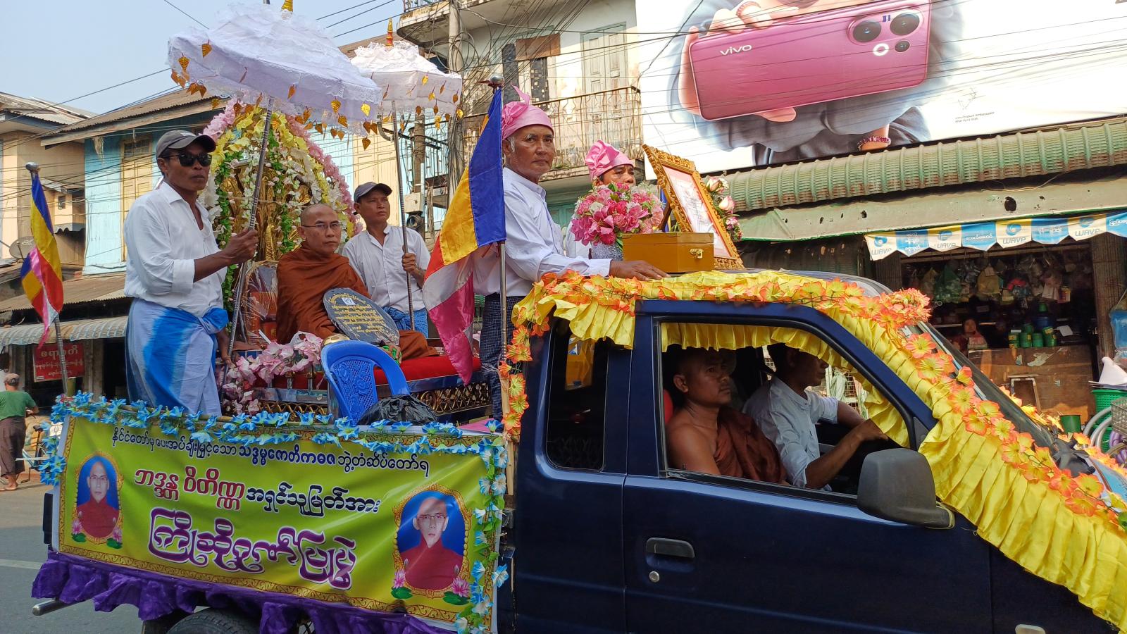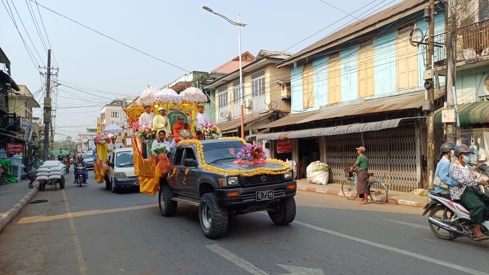 ဧရာဝတီတိုင်းဒေသကြီး၊ ဖျာပုံခရိုင်၊ ဖျာပုံမြို့နယ်တွင် သာသနာတော်ဆိုင်ရာ မဟာကမ္မဋ္ဌာနစရိယနှင့် သဒ္ဓမ္မဇောတိကဓဇ ဘွဲ့တံဆိပ်တော်ရရှိတော်မူကြသော ဆရာတော်ကြီးများအား ခရီးဦးကြိုဆို ပင့်ဆောင်လှည့်လည်ပူဇော်ပွဲကို ယမန်နေ့ နေ့လယ်ပိုင်း အချိန်က ဖျာပုံမြို့၌ ကျင်းပသည်။