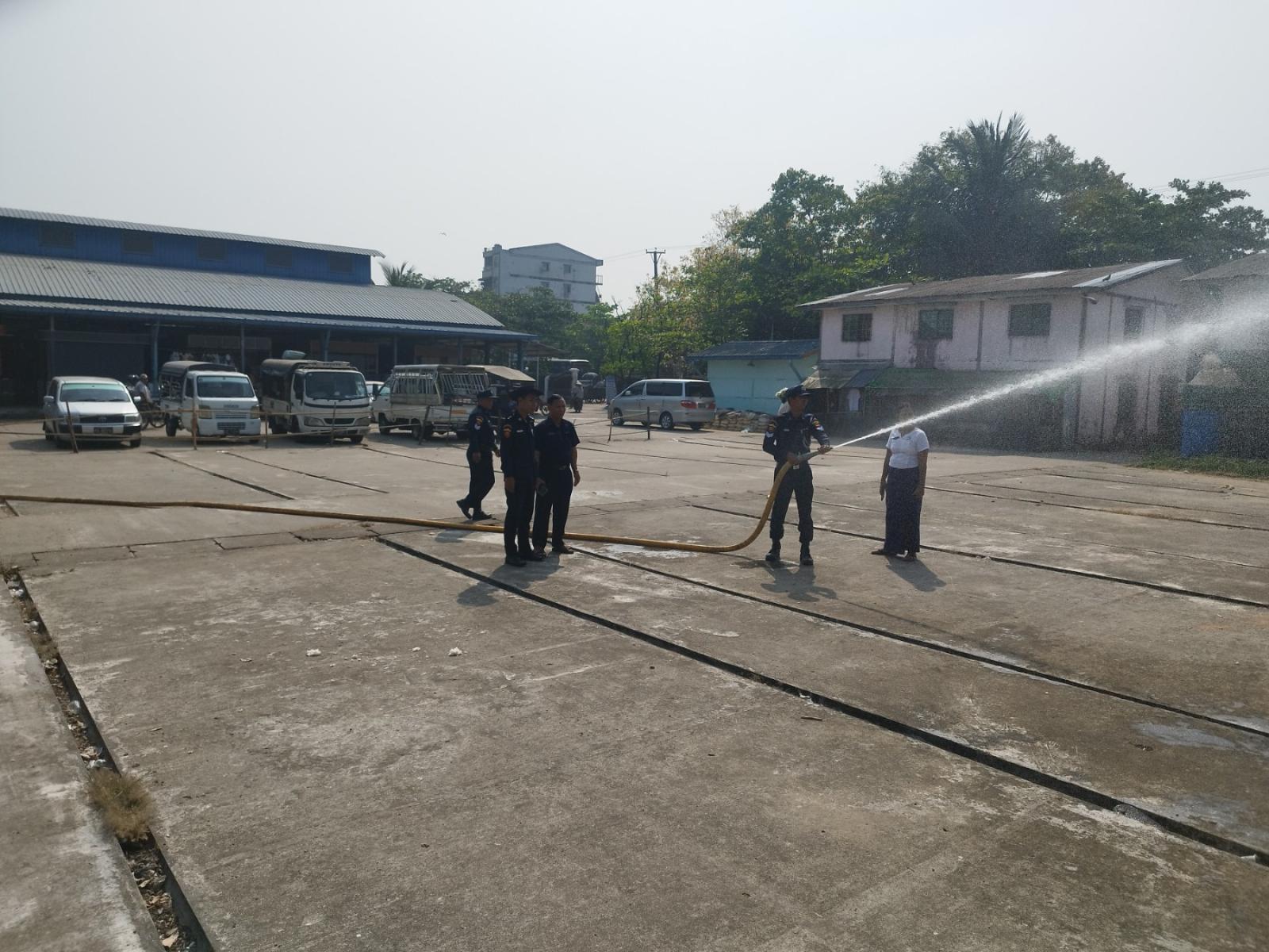 ထို့နောက် မြို့နယ်အတွင်းရှိ ဇီဇဝါ ၁ လမ်း၊ (၂)ရပ်ကွက်ရှိ အမှတ် ၂ စျေးအား မြို့နယ်မီးသတ်ဦးစီးမှူး ဦးစည်သူမျိုးဦဆောင်၍ တပ်ဖွဲ့၀င်များ၊ စျေးဌာနစုမှူးဦးထင်ကျော်၊ စျေးတာဝန်ခံ၊ စျေးညလုံခြုံရေးများပူးပေါင်း၍ ညနေစျေးပိတ်ချိန် ဆိုင်ခန်းများရှိ Breaker များချထားခြင်းရှိ/မရှိ၊ စျေးရေလှောင်ကန်ရေရှိ/မရှိနှင့် စျေးညလုံခြုံရေးများ စျေးအတွင်း မီးငြှိမ်းသတ်ရန်စီမံဆောင်ရွက်ထားသည့် အပေါ့စားစက်အား အသုံးပြုတတ်ခြင်း ရှိ/မရှိ၊ ပိုက်ခေါင်းနော်ဇယ်အား ကိုင်တွယ်အသုံးပြုပုံတို့အား မီးငြှိမ်းသတ်ယာဉ် ၁ စီးဖြင့် စစ်ဆေးလေ့ကျင့်ပေးခဲ့ခြင်းများ ဆောင်ရွက်လျက်ရှိကြောင်း သိရသည်။