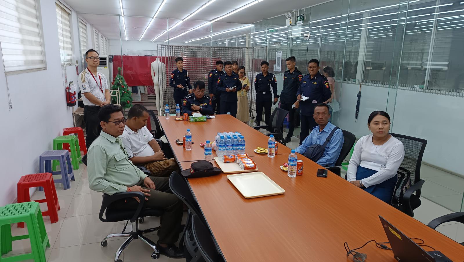 ရန်ကုန်တိုင်းဒေသကြီး၊ ဒဂုံမြို့သစ်ခရိုင်၊ ဒဂုံမြို့သစ် (အရှေ့ပိုင်း) မြို့နယ်၊ ဒဂုံအရှေ့စက်မှုဇုန်ရှိ စက်ရုံ/ အလုပ်ရုံများ မီးဘေးလုံခြုံရေးဆောင်ရွက်ထားရှိမှုကို ယမန်နေ့နံနက်ပိုင်းက ကနောင်မင်းသားကြီးလမ်းရှိ (၅၉+၆၀) General Enterprises Garment သို့ရောက်ရှိရာ စက်ရုံတာဝန်ရှိသူတစ်ဦးမှ မီးဘေးလုံခြုံရေးဆောင်ရွက်ထားရှိမှုအား ရှင်းလင်းဆွေးနွေးခဲ့သည်။