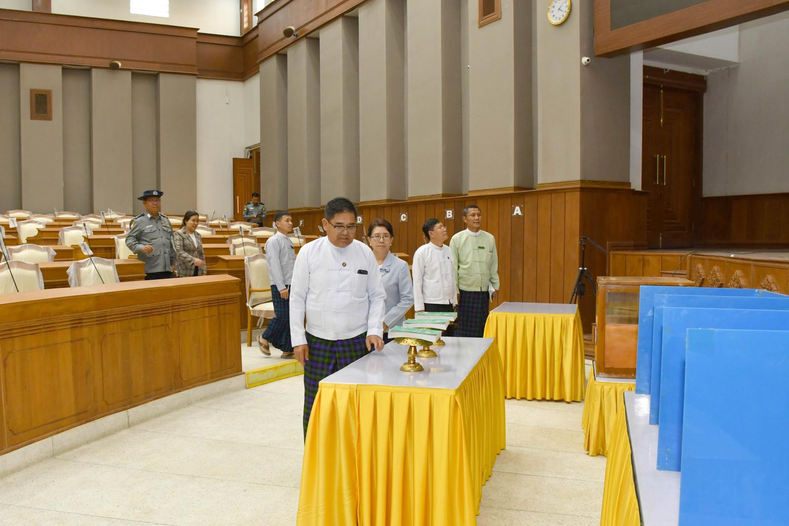 ထိုသို့ ကွင်းဆင်းစစ်ဆေးရာတွင် ပြည်နယ်လွှတ်တော်ရုံး ဒုတိယညွှန်ကြားရေးမှူးချုပ်၊ အရာထမ်း၊ အမှုထမ်းများနှင့်အတူ လွှတ်တော်ရုံး ပတ်ဝန်းကျင်သန့်ရှင်းသာယာလှပရေး ပြုပြင်ဆောင်ရွက်နေမှုများနှင့် လွှတ်တော်အစည်းအဝေးခန်းမ၌ အသံပိုင်းဆိုင်ရာ ပြင်ဆင်ဆောင်ရွက်မှု၊ နေရာချထားမှုပုံစံများ၊ မှတ်တမ်းတင်နိုင်ရေး စီစဉ်ဆောင်ရွက်ထားရှိမှုများနှင့် ဆန္ဒမဲပေးနိုင်ရေး ကြိုတင်ပြင်ဆင်ဆောင်ရွက်ထားရှိမှုများနှင့် လွှတ်တော်ရုံးနှင့်ကပ်လျက် လွှတ်တော်ကိုယ်စားလှယ်များ တည်းခိုနားနေဆောင်၌ လွှတ်တော်ကိုယ်စားလှယ်များ တည်းခိုနေထိုင်နိုင်ရေး ကြိုတင်ပြင်ဆင်ဆောင်ရွက်ထားရှိမှုများကို ကြည့်ရှုစစ်ဆေးခဲ့ကြပြီး လိုအပ်သည်များကို ပေါင်းစပ်ညှိနှိုင်း၍ ဖြည့်ဆည်းဆောင် ရွက်ပေးခဲ့သည်။