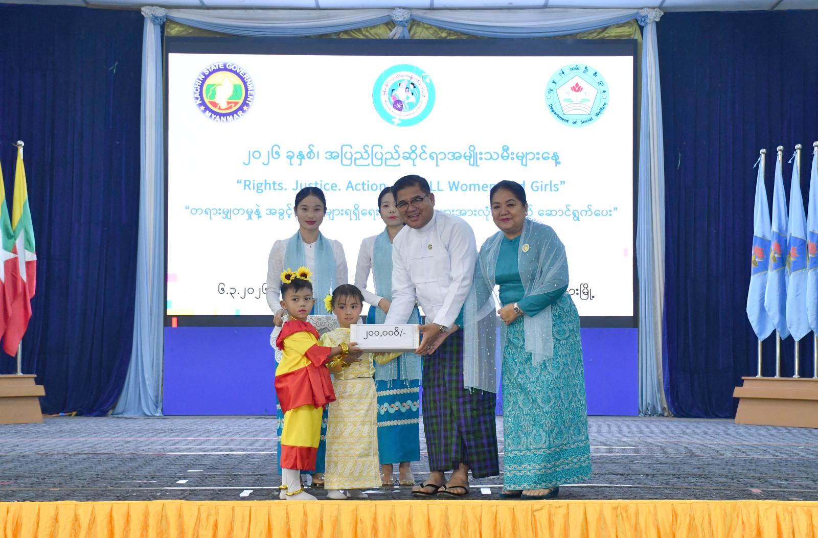 ထို့နောက် အပြည်ပြည်ဆိုင်ရာအမျိုးသမီးများနေ့အထိမ်းအမှတ် ဂုဏ်ပြုသောအားဖြင့် သံလွင်ပရဟိတဂေဟာ၊ အမှတ်(၂) မူလတန်းကြိုကျောင်း၊ မေတ္တာရင်ခွင်ပရဟိတဂေဟာများမှ သမီးငယ်လေးများက တိုင်းရင်းသားတေးသီချင်း သရုပ်ဖော်အကအလှများဖြင့် ဖျော်ဖြေတင်ဆက်မှုကို ကြည့်ရှုအားပေးခဲ့ကြပြီး ပြည်နယ်ဝန်ကြီးချုပ်နှင့်ဇနီး၊ ပြည်နယ်အမျိုးသမီးကော်မတီဥက္ကဋ္ဌ၊ ပြည်နယ်လူမှုရေးရာဝန်ကြီး ဦးမိုးမင်းသိန်းတို့က ဖျော်ဖြေရေးအဖွဲ့များအတွက် ချီးမြှင့်ငွေများကို ပေးအပ်ချီးမြှင့်ခဲ့ကြကာ အခမ်းအနားတက်ရောက်လာကြသည့် ဌာနဆိုင်ရာများ၊ လူမှုကူညီရေးအသင်းအဖွဲ့များနှင့်အတူ အမှတ်တရ စုပေါင်းမှတ်တမ်းတင် ဓာတ်ပုံရိုက်ကူးခဲ့ကြသည်။