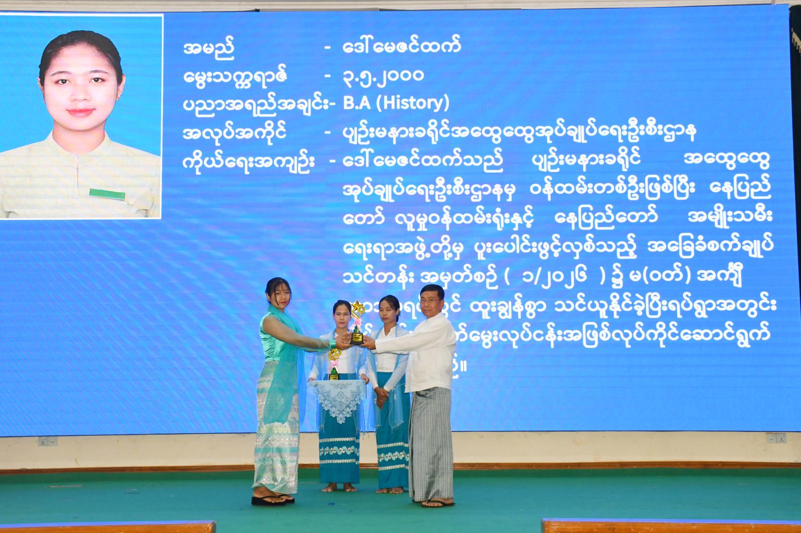ယင်းနောက် ပျဉ်းမနားခရိုင် အမျိုးသမီးရေးရာအဖွဲ့မှ အလှကမ္ဘာမြေတေးသီချင်းနှင့် မမကိုယ်တိုင်က တေးသီချင်းများဖြင့်လည်းကောင်း၊ ဇေယျာသီရိမြို့နယ် အမျိုးသမီးရေးရာအဖွဲ့မှ ချင်းတို့ဌာနေ တေးသီချင်းဖြင့် လည်းကောင်း၊ နေပြည်တော်ကလေးပြုစုရေးဌာန သမီးငယ်လေးများက ရက်မြတ်မင်္ဂလာ တေးသီချင်းဖြင့်လည်းကောင်း အသီးသီးကပြဖျော်ဖြေတင်ဆက်ခဲ့ပြီး ဖျော်ဖြေတင်ဆက်ခဲ့သည့် အဖွဲ့များအား နေပြည်တော်ကောင်စီဝင် ဦးမြင့်စိုးက ဂုဏ်ပြုဆုများ ချီးမြှင့်ခဲ့ကြောင်း သိရသည်။