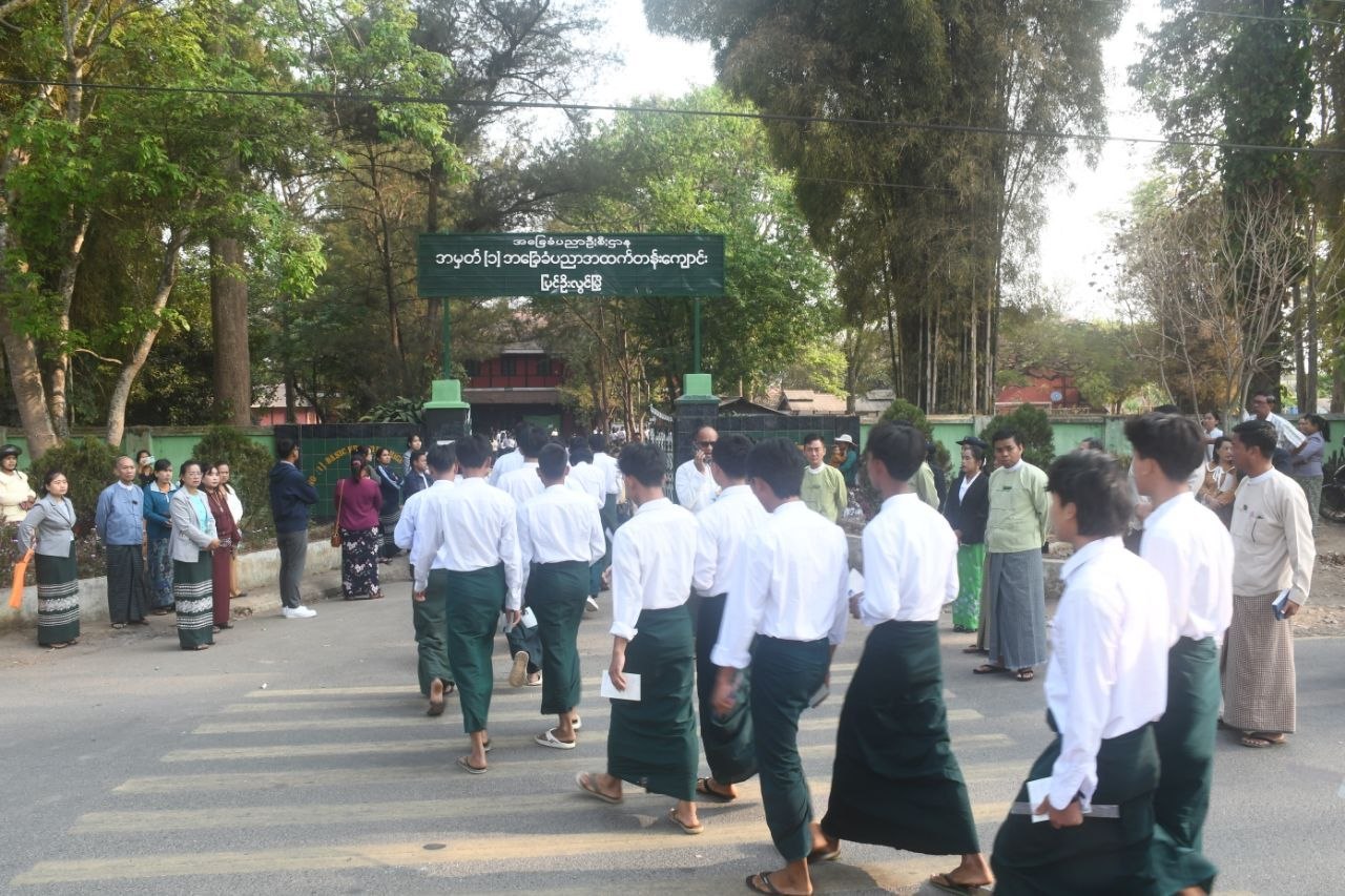 မန္တလေးတိုင်းဒေသကြီး ပြည်ကြီးတံခွန်၊ ပြင်ဦးလွင်၊ ပုသိမ်ကြီး၊ တံတားဦး၊ စဉ့်ကိုင်၊ သာစည်၊ ကျောက်ဆည်၊ မြစ်သားနှင့် ငါန်းဇွန်မြို့နယ်တို့၌ စာစစ်ဌာနများတွင် ယနေ့ နံနက်ပိုင်းက စတင်၍ ၂၀၂၅-၂၀၂၆ ပညာသင်နှစ်၊ တက္ကသိုလ်ဝင်စာမေးပွဲကို ပထမနေ့မြန်မာစာဘာသာရပ်အား Grade-12 ကျောင်းသား/ကျောင်းသူများက အေးချမ်းစွာဖြေဆိုလျက်ရှိသည်။