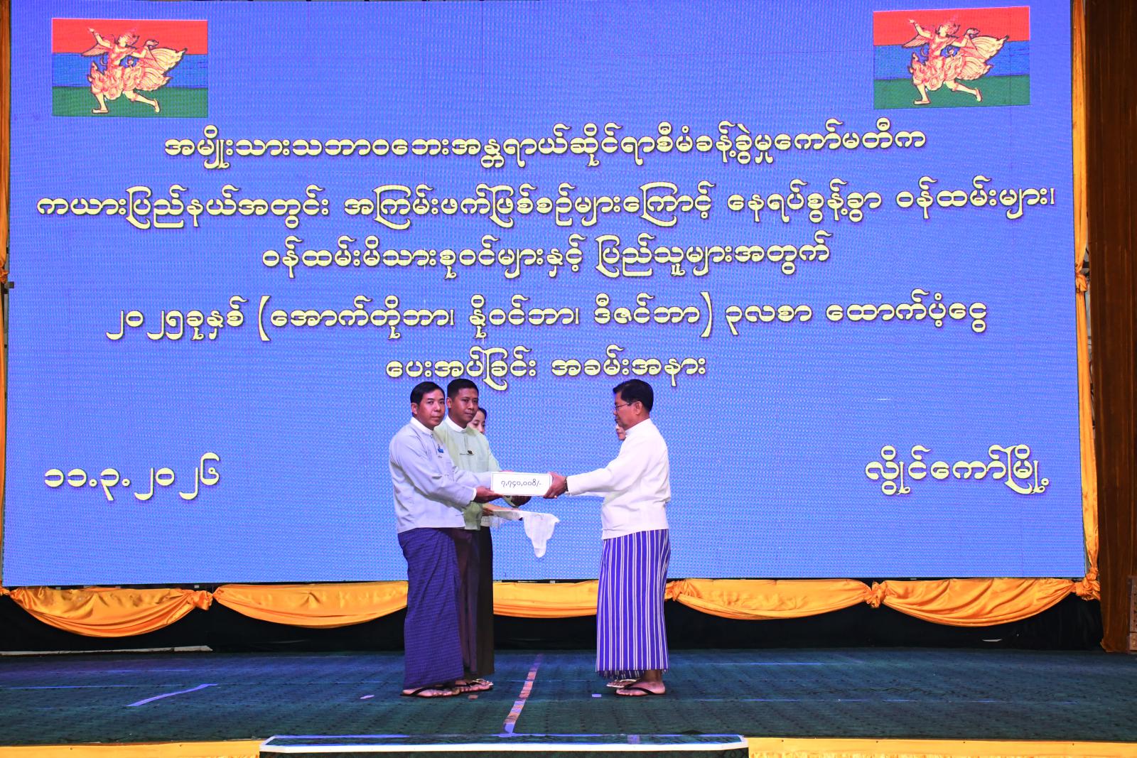 ထို့နောက် ပြည်နယ်ဝန်ကြီးချုပ်နှင့် တာဝန်ရှိသူများက ယာယီနေရပ်စွန့်ခွာဝန်ထမ်းများ၊ မိသားစုဝင်များနှင့် ဒေသနေပြည်သူများအတွက် ၂၀၂၅ ခုနှစ် (အောက်တိုဘာ၊ နိုဝင်ဘာ၊ ဒီဇင်ဘာ) သုံးလအတွက် ထောက်ပံ့ငွေများကို ပေးအပ်ရာ ကိုယ်စားလှယ်များက အသီးသီးလက်ခံရယူခဲ့ကြသည်။